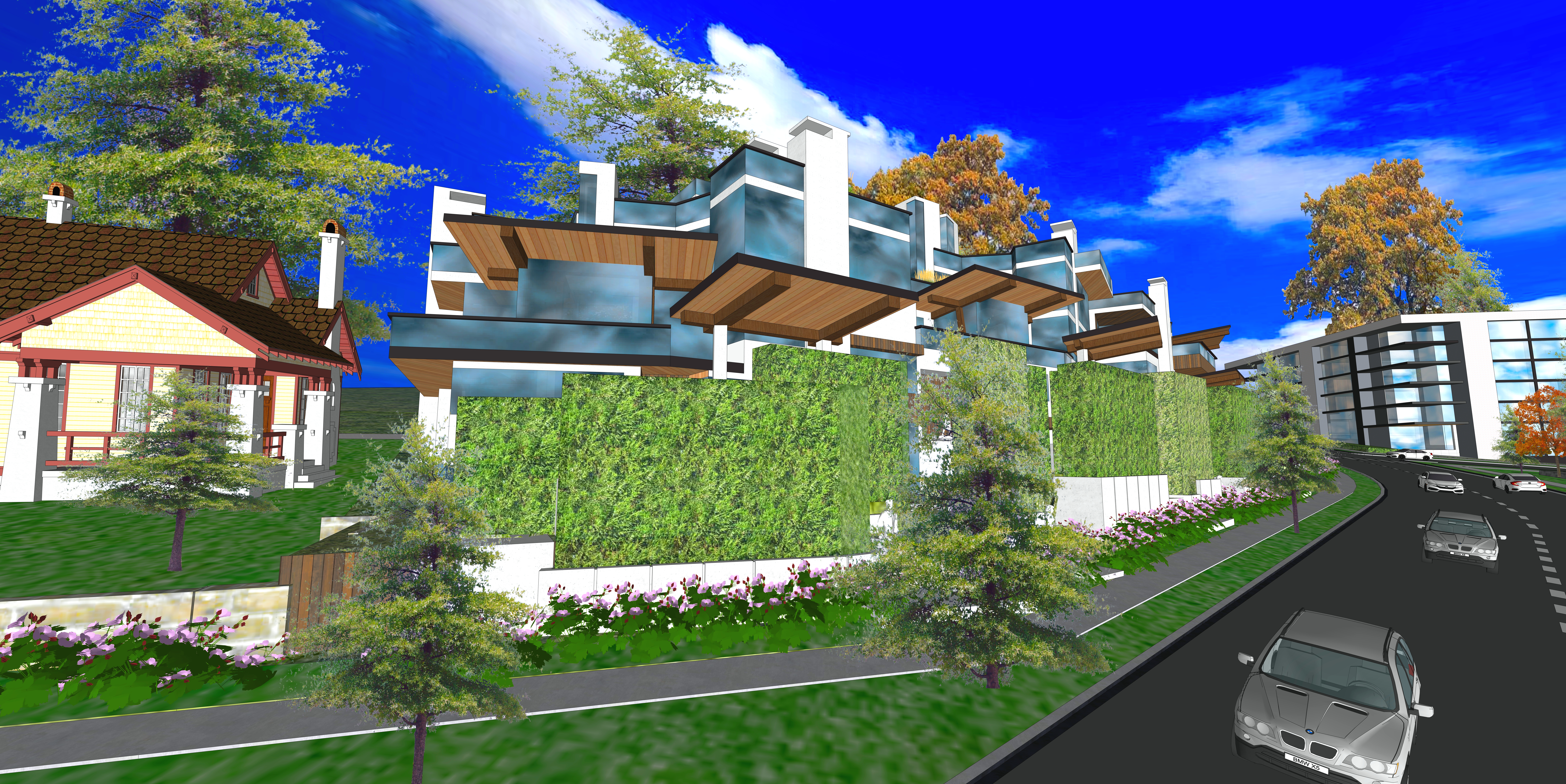 modernist exterior shot lush leafy hedges along street cedar wood under soffits keep and maintain all design architecture from image selection dark black asphalt on all streets big trees behind building render a very photo realistic image and maintain the input architecture dark black asphalt street with curbs and a dotted white center line lush leafy hedges on left side bright early morning blue sky with sparse puffy clouds new cars on the street in motion grass inbetween sidewalk and curbs wood under soffits concrete exterior building finishes lush huge trees behind buildings sidewalks on both sides of the street architecture