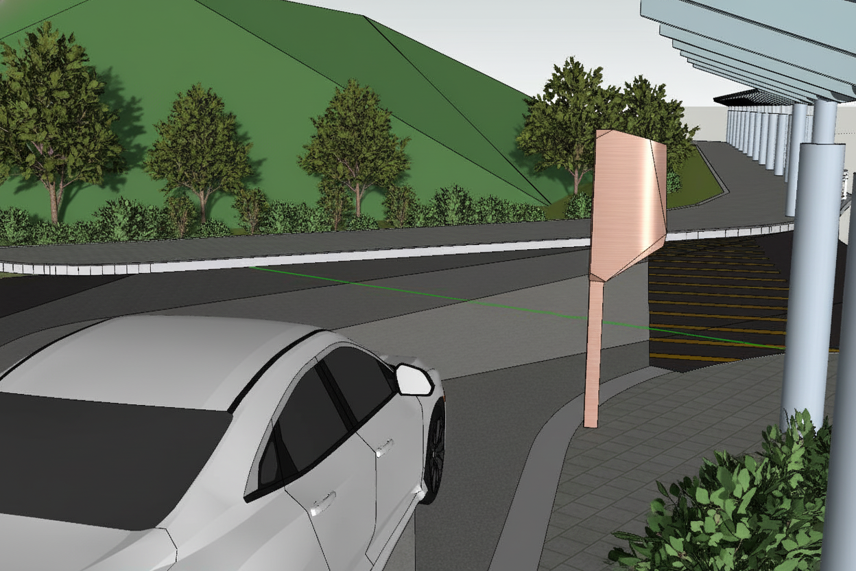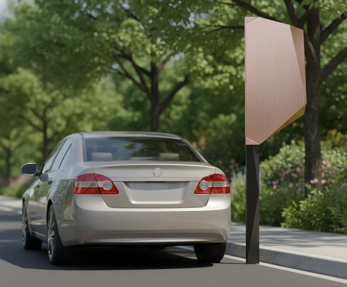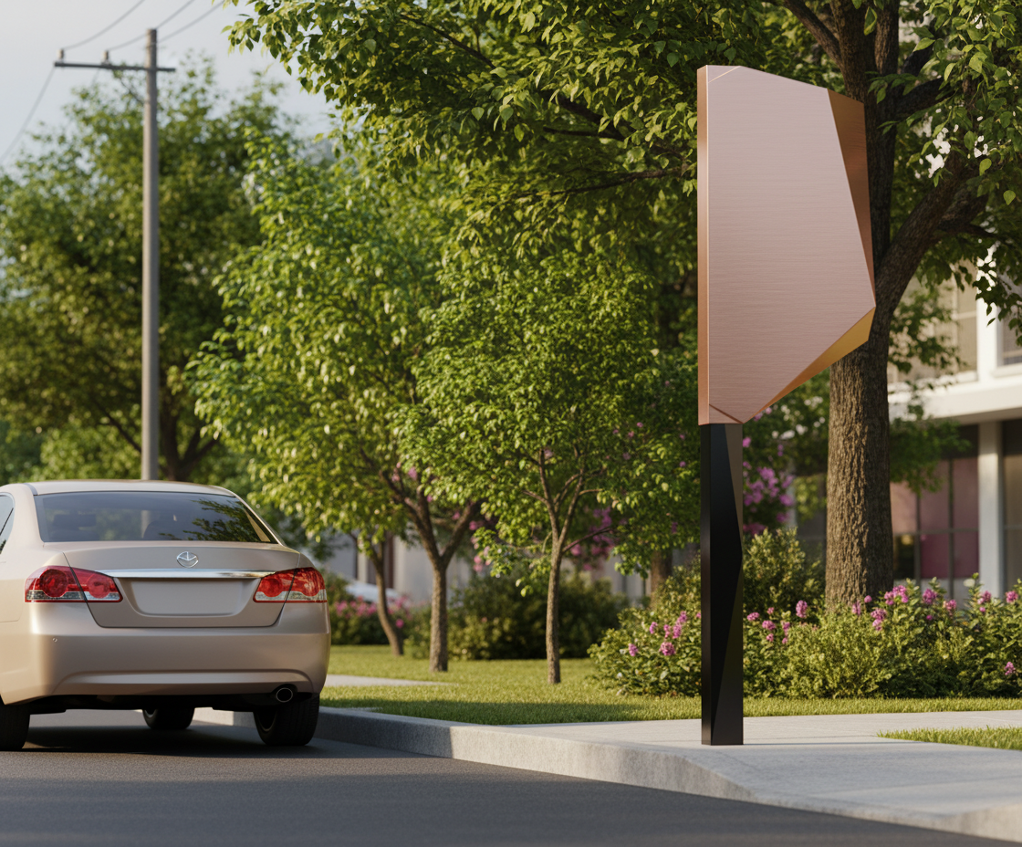 convert this signage design graphic into a realistic 3d external pole signage and render the entire sketchup environment into a photorealistic outdoor scene show the signage in a dynamic perspective view positioned by the roadside with a partial view of a car beside it for scale the signage panel is made of aluminum with a hairline rose gold finish featuring soft bends as shown in the design reference shading the supporting pole is painted in a black semi gloss finish add realistic trees shrubs and roadside landscaping to enhance the environment signage dimensions 540 mm wide 2250 mm tall render using archsynth architectural realism natural daylight cinematic depth photorealistic materials accurate reflections and cohesive lighting integration within the full sketchup environment
