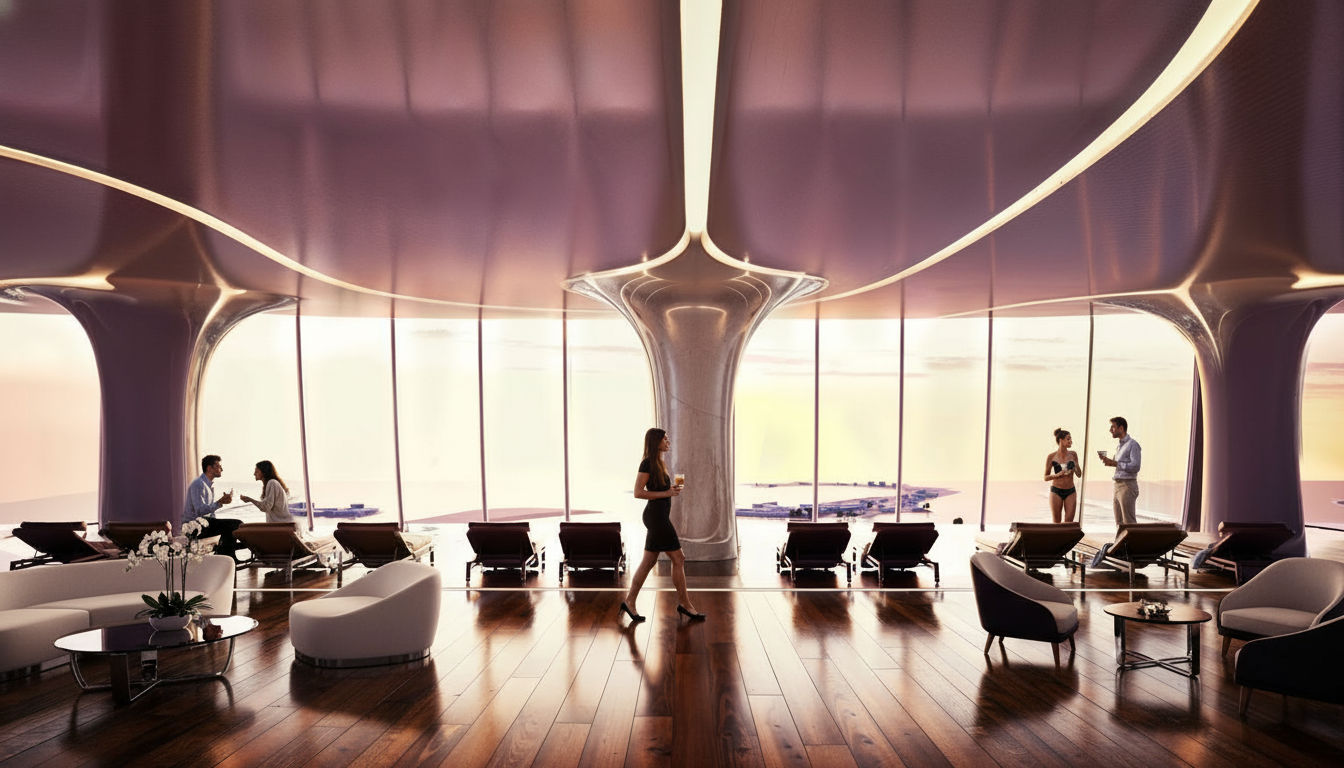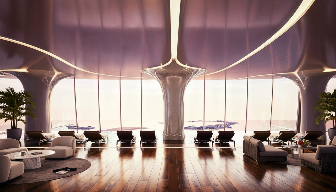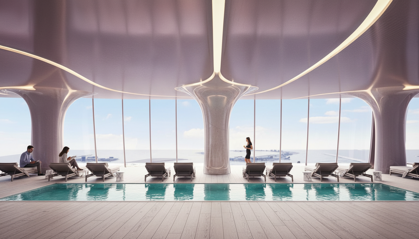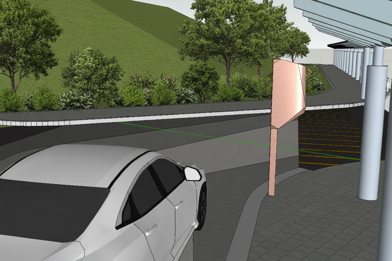 convert this signage design graphic into a realistic 3d external pole signage and render the entire sketchup environment into a photorealistic outdoor scene show the signage in a dynamic perspective view positioned by the roadside with a partial view of a car beside it for scale the signage panel is made of aluminum with a hairline rose gold finish featuring soft bends as shown in the design reference shading the supporting pole is painted in a black semi gloss finish add realistic trees shrubs and roadside landscaping to enhance the environment signage dimensions 540 mm wide 2250 mm tall render using archsynth architectural realism natural daylight cinematic depth photorealistic materials accurate reflections and cohesive lighting integration within the full sketchup environment