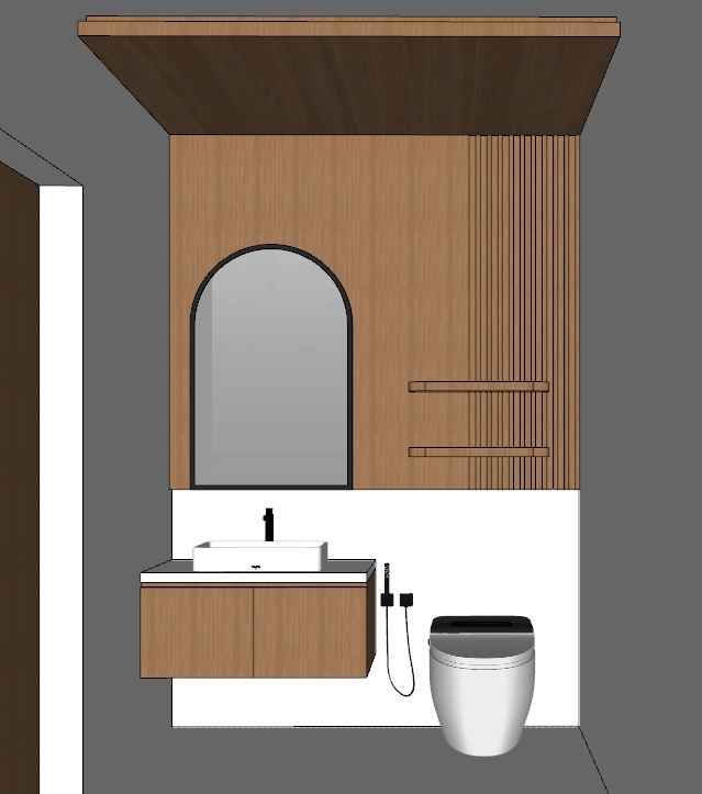 create an ultra realistic image from this jpg add ceiling spot lights use matte light cream stone textured to all the wall and use matte warm light grey stone textured for the floor and the ceiling is white and add indirect light to the shelves add some decoration and add indirect light to the wood ceiling panel add indirect light all around the mirror