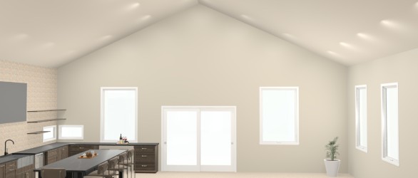 add vertical shiplap paneling to the walls in the same color add dark metal to the ceiling along with wood beams add mid toned wood flooring leave everything else as it is