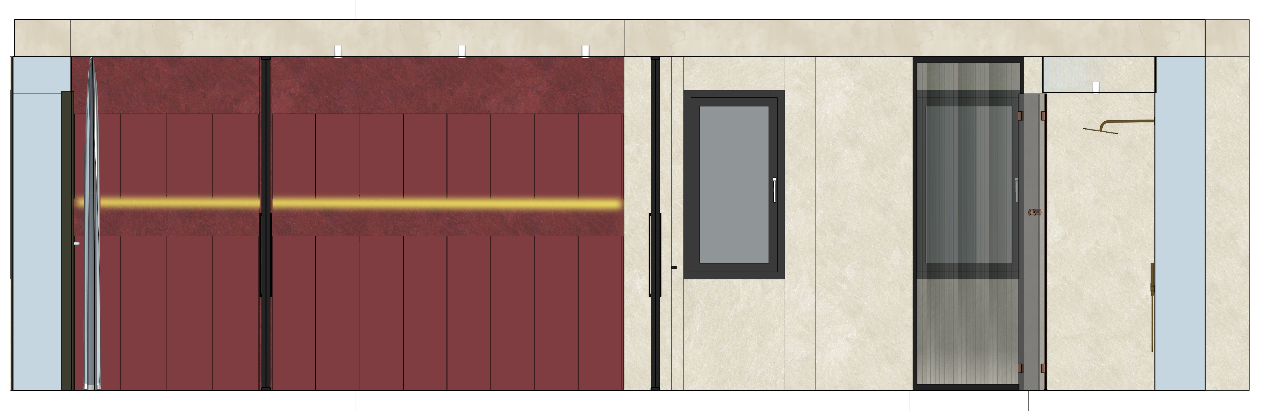 front elevation architectural rendering of a contemporary interior wall composition maintain exact composition proportions alignment and all architectural elements do not modify layout geometry or spacing in any way preserve all existing materials textures colors and finishes exactly as shown deep burgundy vertical paneling with a slightly textured materic finish horizontal integrated warm light strip crossing the paneling beige stone effect wall cladding with subtle natural variation dark framed window with opaque glass dark metal framed door with semi transparent ribbed glass minimal vertical black handle detail light neutral ceiling band above white background only no environment no exterior context no additional elements apply a refined high end architectural visualization style warm soft diffused lighting subtle glow from the integrated light strip not overexposed soft shadows and ambient occlusion to enhance depth realistic material response with slightly matte tactile surfaces controlled reflections on glass and metal elements ensure balanced contrast and a warm color temperature to avoid cold or sterile appearance ultra clean presentation sharp details high realism architectural visualization quality