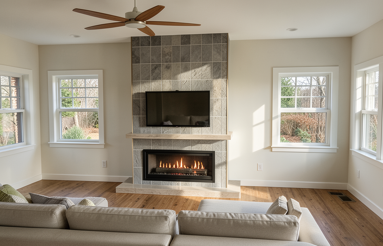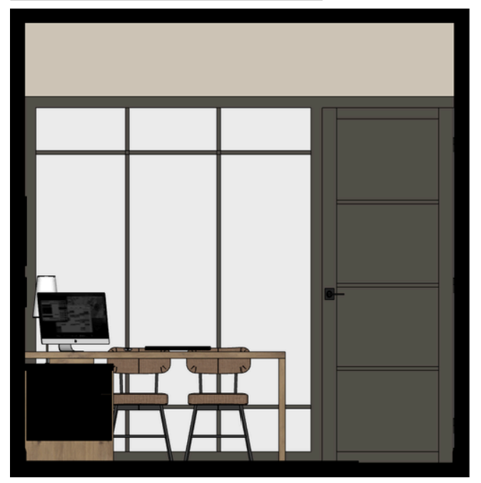 create a cozy and elegant home office setting with a modern minimalist design the room features a large wooden desk in a natural oak finish surrounded by high backed chairs in a soft beige fabric a sleek curved monitor sits on the desk the wall behind the desk boasts built in bookshelves painted in a rich charcoal gray filled with assorted books and artistic ceramics in muted tones add a touch of greenery with a cascading indoor plant the walls are a soft taupe adorned with black and white photographs in black frames the flooring is a warm medium oak complemented by a plush light gray area rug under the desk the lighting includes a contemporary floor lamp in matte black with a white shade the atmosphere is peaceful and sophisticated with diffused natural light enhancing the calming ambiance