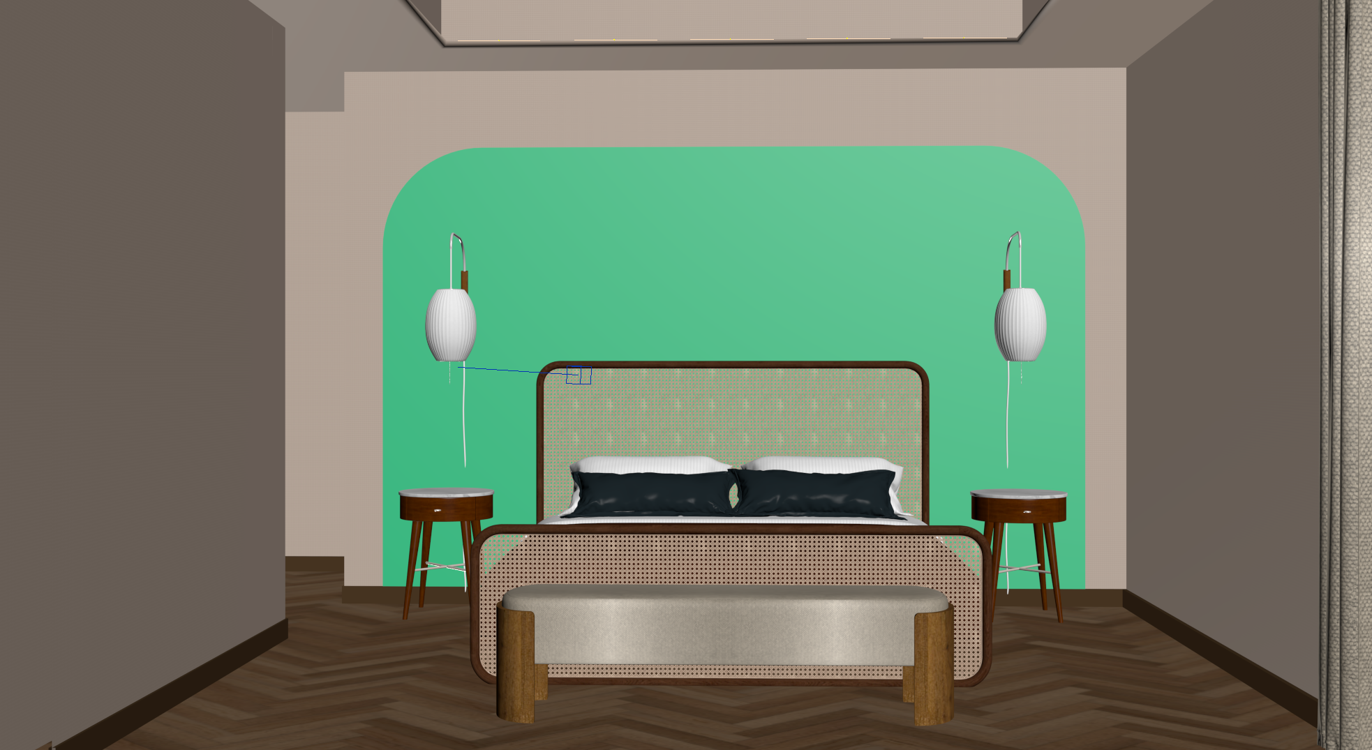 interior shot render a photorealistic 3d perspective of this bedroom reference the material style from the mood board and the back head material but it in the green wall same wall material and texture from the mood board do not change the view only enhance the current materials and detailed render in hyper realistic visualization quality 8k resolution add natural sun light add hidden light in ceiling boarder