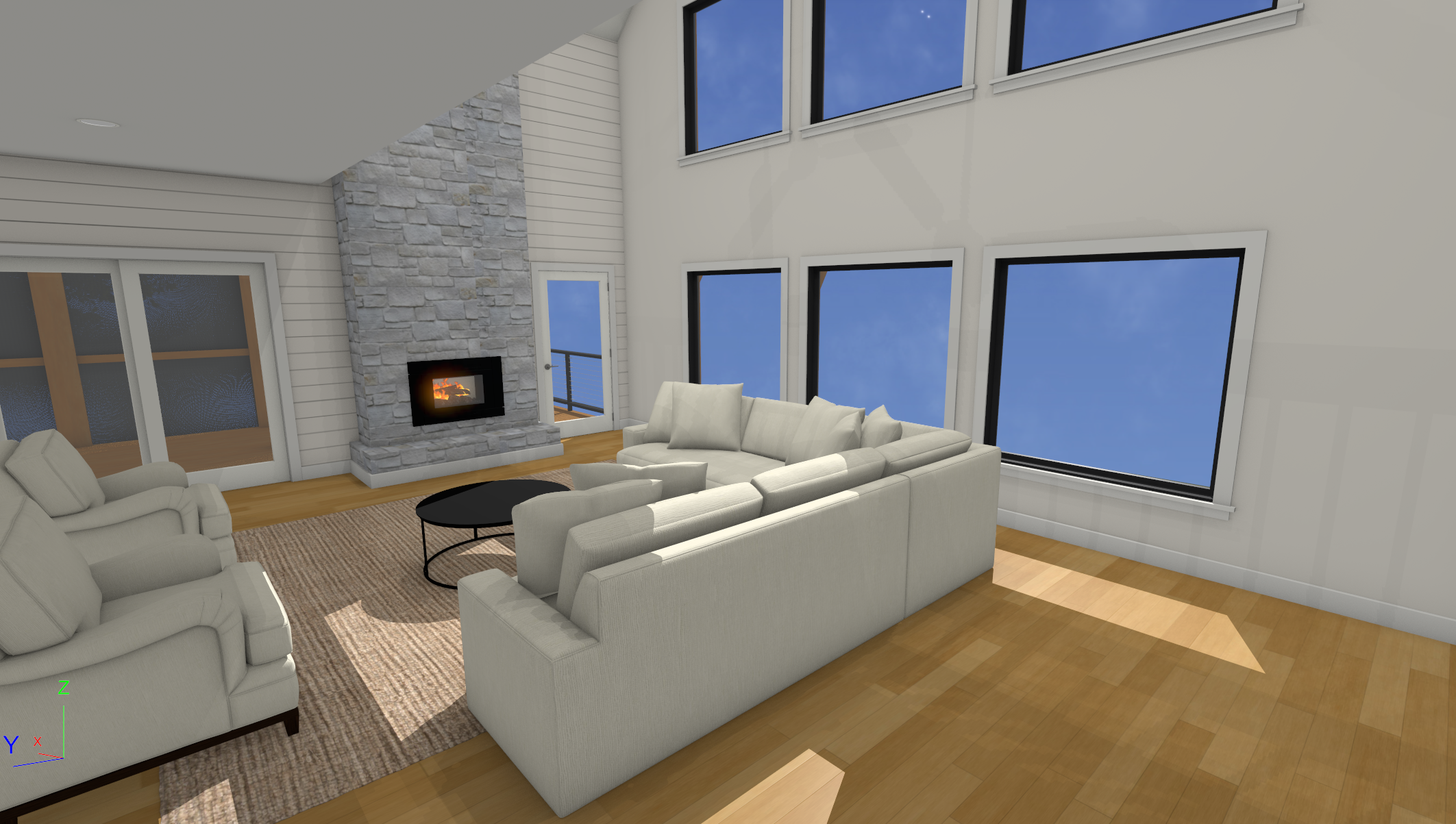 decorate this room with transitional decor the view out the windows should be some mature oak trees a small road and a lake across the street
