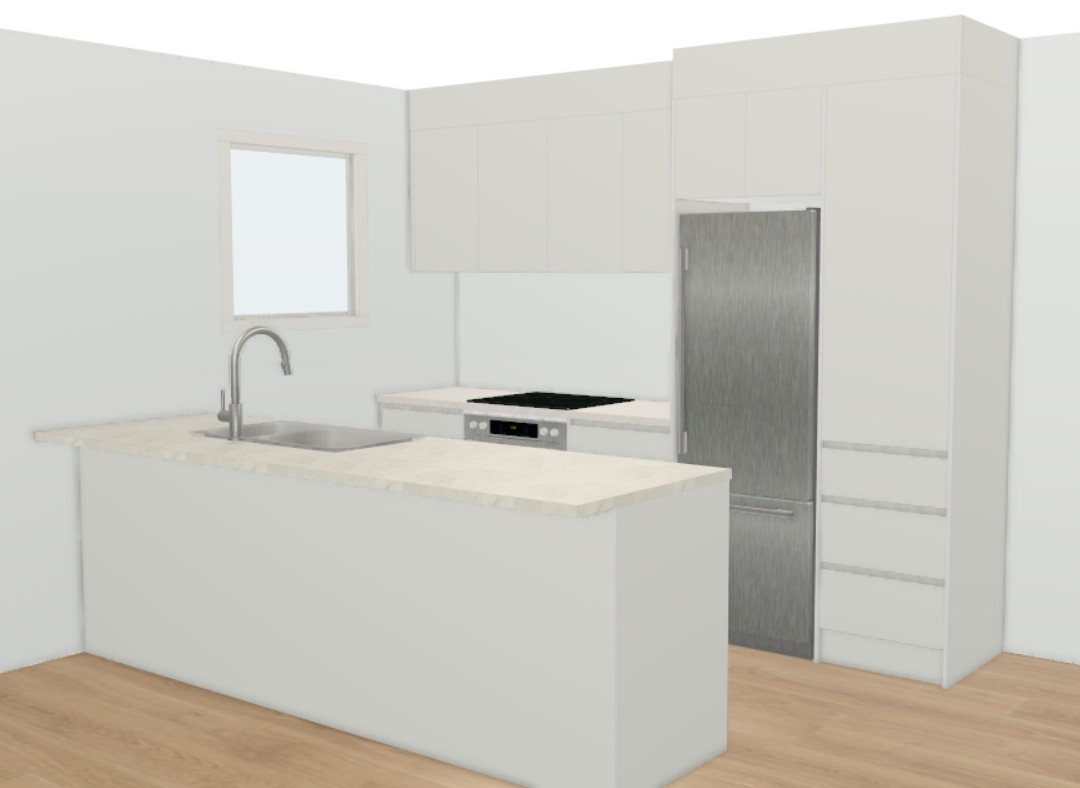 add natural light through window and add kitchen decor with someone standing at the island preparing dinner
