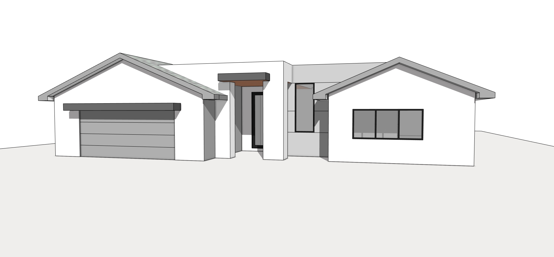 a modern single story house with a sleek minimalist design the exterior is a white and gray with subtle gray accents on the roof edges and window frames roof is gray concrete tiles the garage door is a smooth shade of charcoal gray large black framed windows add a touch of elegance the atmosphere is serene and contemporary set in a tranquil morning light with a soft blue sky and lush florida green landscaping dotted with vibrant flowers
