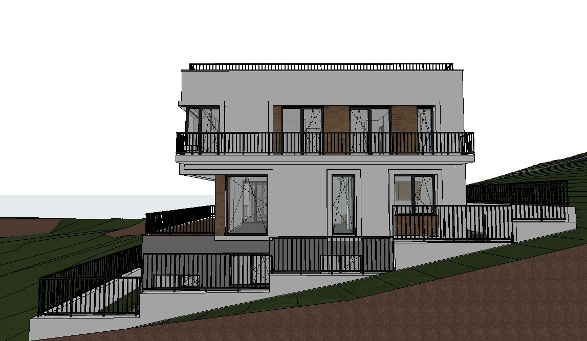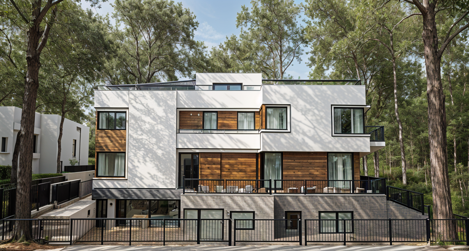 modernist exterior shot a beautifully rendered modern minimalist house set amidst a serene natural environment the house features angular wooden structures with a dark gray and black exterior large glass windows reflect the subtle hues of the surrounding landscape the wooden siding has warm earthy tones like soft browns and is combined with sleek contemporary black trimming the atmosphere is tranquil and the lighting is soft mimicking a gentle morning or late afternoon light the ground is adorned with patches of green moss and vivid yellow wildflowers adding a burst of color and life the surrounding trees are leafless drawn with delicate thin black lines indicating the late autumn season shadows of the trees create an intricate pattern on the house and the ground in varying shades of gray and brown the entire setting feels both modern and natural embracing simplicity and elegance architecture white facade keep windows from concept the background is forest please preserve the architecture and proportions of the building behind the building we have a slope and a forest