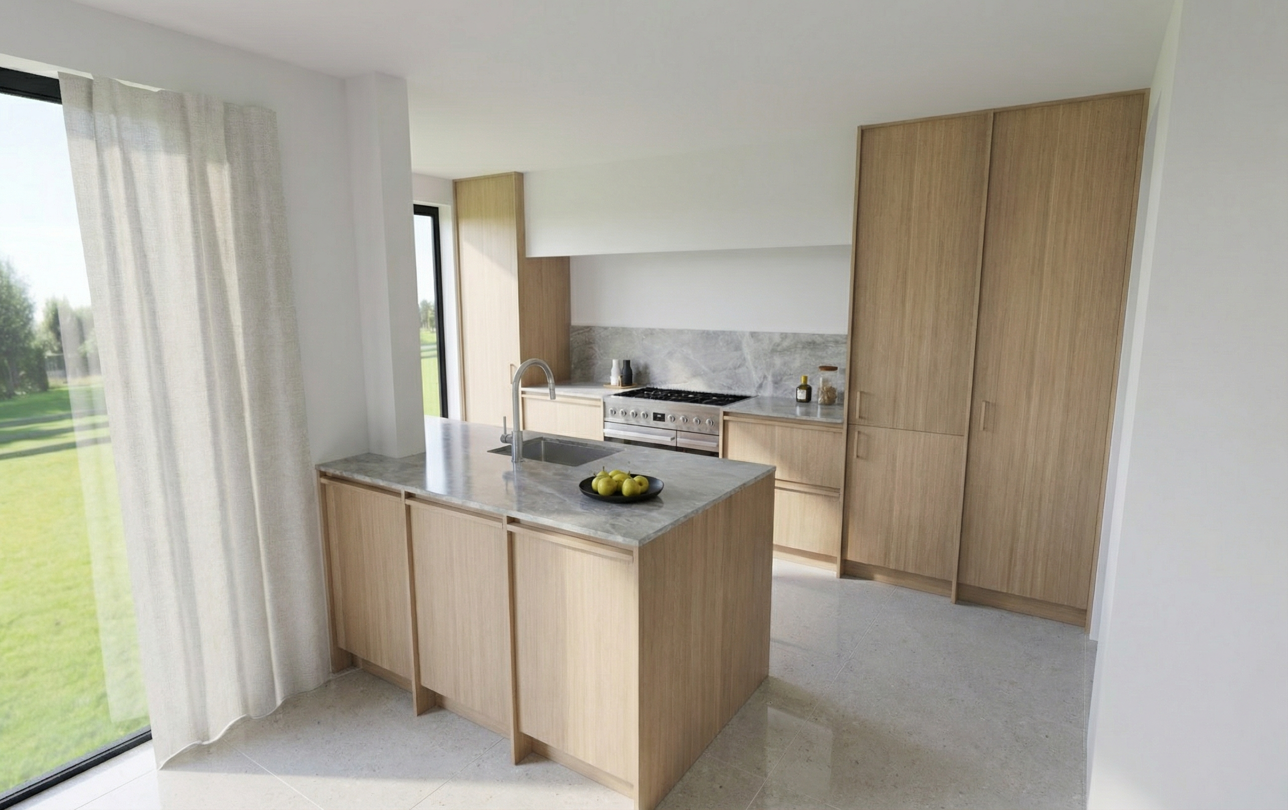 render a modern bathroom from a top down perspective the floor and walls are covered in sleek white tiles creating a clean and spacious atmosphere the vanity cabinet is a light gray adding a hint of contrast the shelves and storage are a natural wood color bringing warmth to the room the window adds a soft natural light illuminating the space beautifully the overall atmosphere is serene and minimalist with neutral tones and a touch of elegance