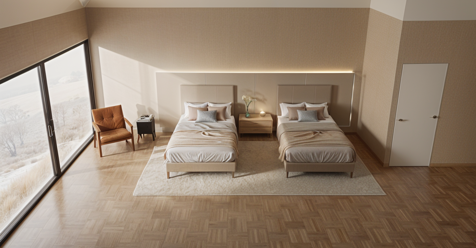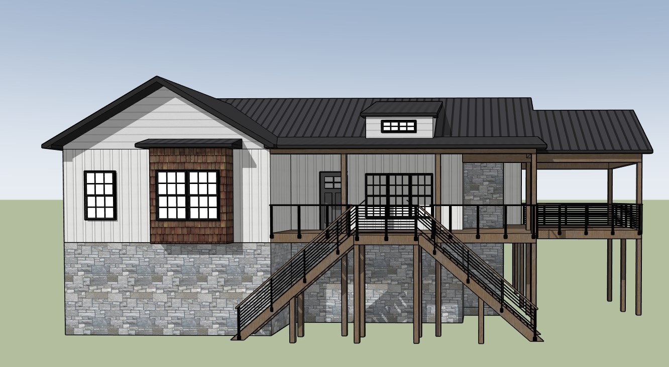 driveway on lower left side with mature trees on the left and in back yard large landscaping on the front left side cable railings on deck appalachian mountain scene on right clouds in the sky