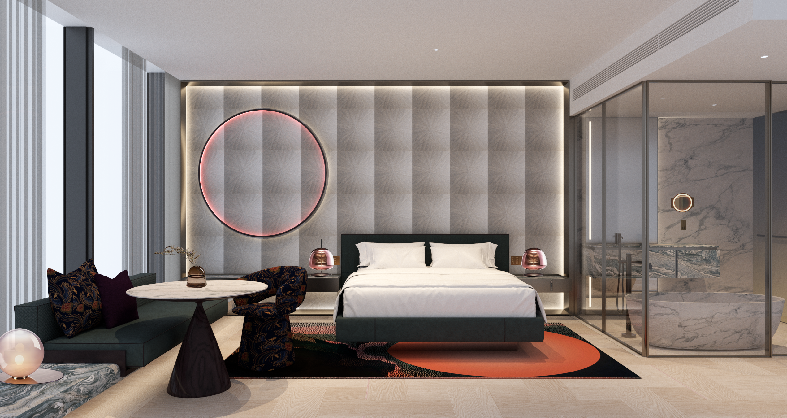 enhance overall material realism to achieve a refined luxury hotel atmosphere maintain the original design intent layout furniture lighting fixtures and material proposal without any changes enhance overall material realism to achieve a refined luxury hotel atmosphere maintain the original design intent layout furniture lighting fixtures and material proposal without any changes set the room lighting to a warm 3000k tone to create a comfortable elegant and relaxing hotel ambiance ensure the lighting feels soft balanced and realistic while highlighting material quality all table lamps must be switched on and properly illuminated to contribute to the warm hotel atmosphere enhance realism through accurate textures reflections shadows and natural light behavior only produce a clean professional photorealistic luxury hotel interior render ensure the lighting feels soft balanced and realistic while highlighting material quality enhance realism through accurate textures reflections shadows and natural light behavior only produce a clean professional photorealistic luxury hotel interior render