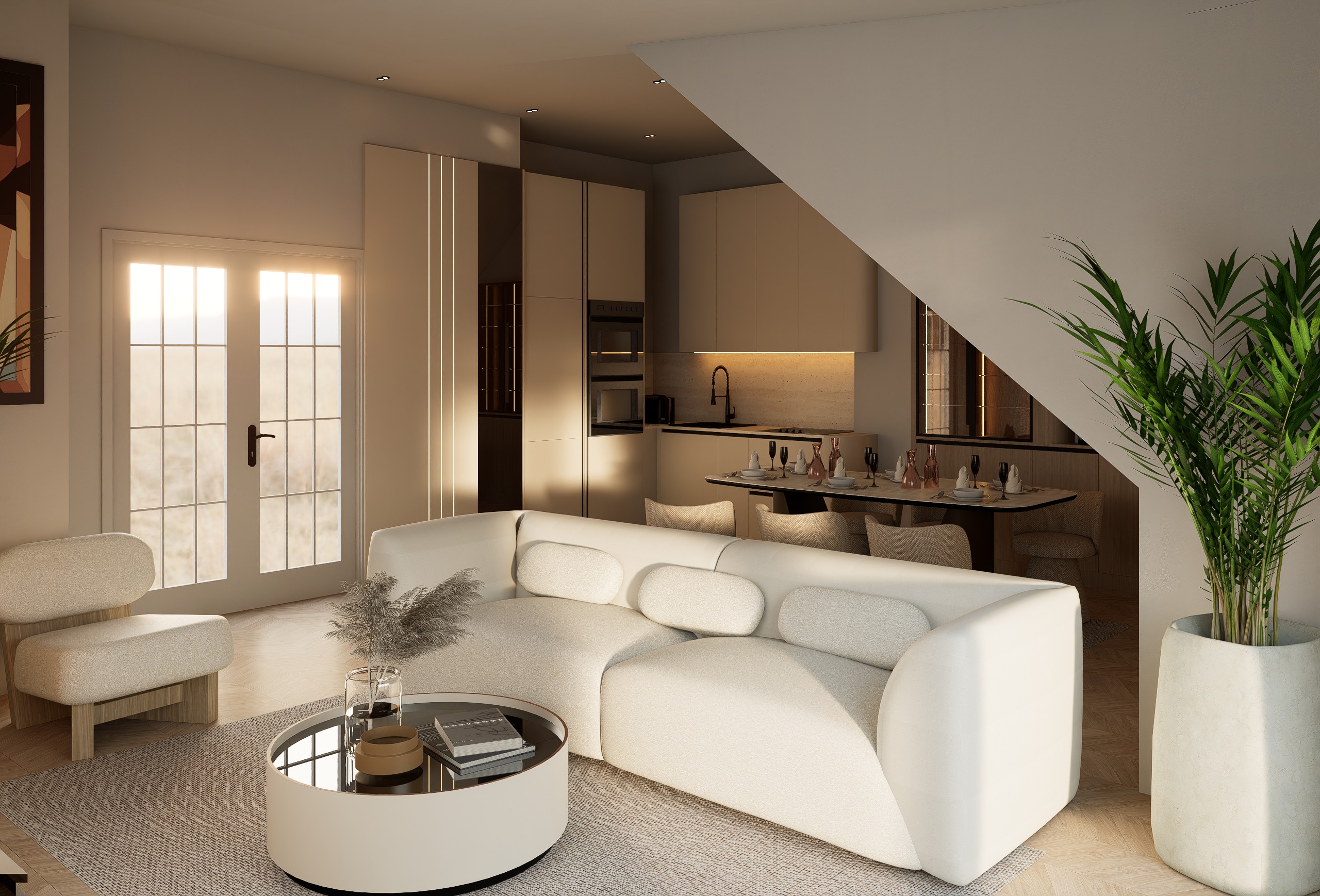 ultra realistic interior render of an open plan luxury living room kitchen preserve exact architecture layout furniture placement and camera angle do not alter geometry proportions or design materials finishes kitchen cabinets matte soft touch beige cream finish flat panels handleless ultra clean edges tall units same finish with integrated vertical led strips 3000k subtle and continuous countertop backsplash light travertine limestone effect horizontal texture matte finish dining back wall dark warm walnut wood paneling matte satin continuous grain glass cabinet dark wood frame with smoked glass doors warm internal lighting floor light oak herringbone parquet matte finish living area sofa sculptural curved modular sofa soft beige fabric smooth surface no stitching or segmentation lounge chair matching language beige textured fabric with light wood base coffee table round minimal glossy top surface with soft reflections decor styling coffee table 2 3 books glass vase with dry branches keep exactly minimal dining table clean setup with plates napkins and a few glasses refined not busy back counter small cluster of dark bottles one large indoor plant right side natural green soft realistic leaves lighting strong natural sunlight entering from left doors slightly directional creating soft long shadows exterior slightly blown out for realism under cabinet led 3000k soft continuous strip ceiling recessed spotlights warm tone vertical led accents on tall cabinets mood warm late afternoon sunlight feeling soft cinematic contrast slightly deeper shadows than standard clean luxury atmosphere no overexposure inside rendering style photorealistic ultra detailed soft global illumination with strong natural light dominance realistic reflections especially on coffee table and floor slight depth of field very subtle camera keep exact camera position and framing wide interior shot slightly angled toward kitchen maintain same lens feel and exposure as previous renders for consistency