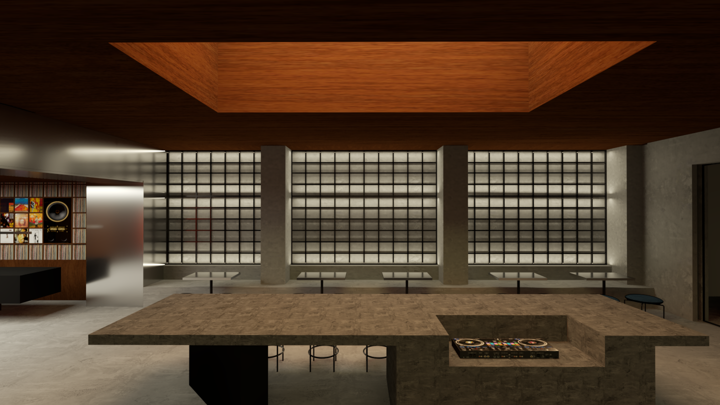 hotorealistic enhancement of materials and lighting improve material realism with finer texture detail natural imperfections and accurate roughness enhance the existing lighting atmosphere with slightly softer shadows and gentle light diffusion do not add any new light sources or fixtures do not alter the scene layout materials or camera composition avoid heavy ai stylization keep the image natural minimal and close to a real architectural photograph nightime bar atmospheric lights