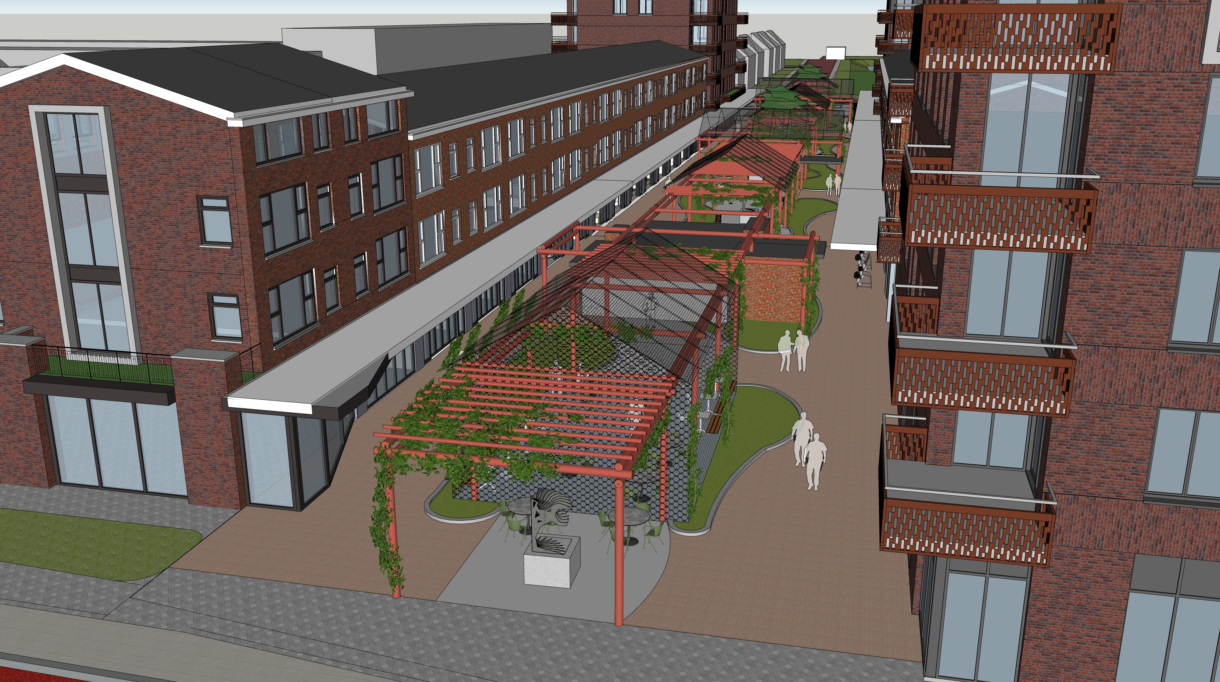 stay close to original image add many people who are shopping add a lot of plants flowers and bushes make a sunny day