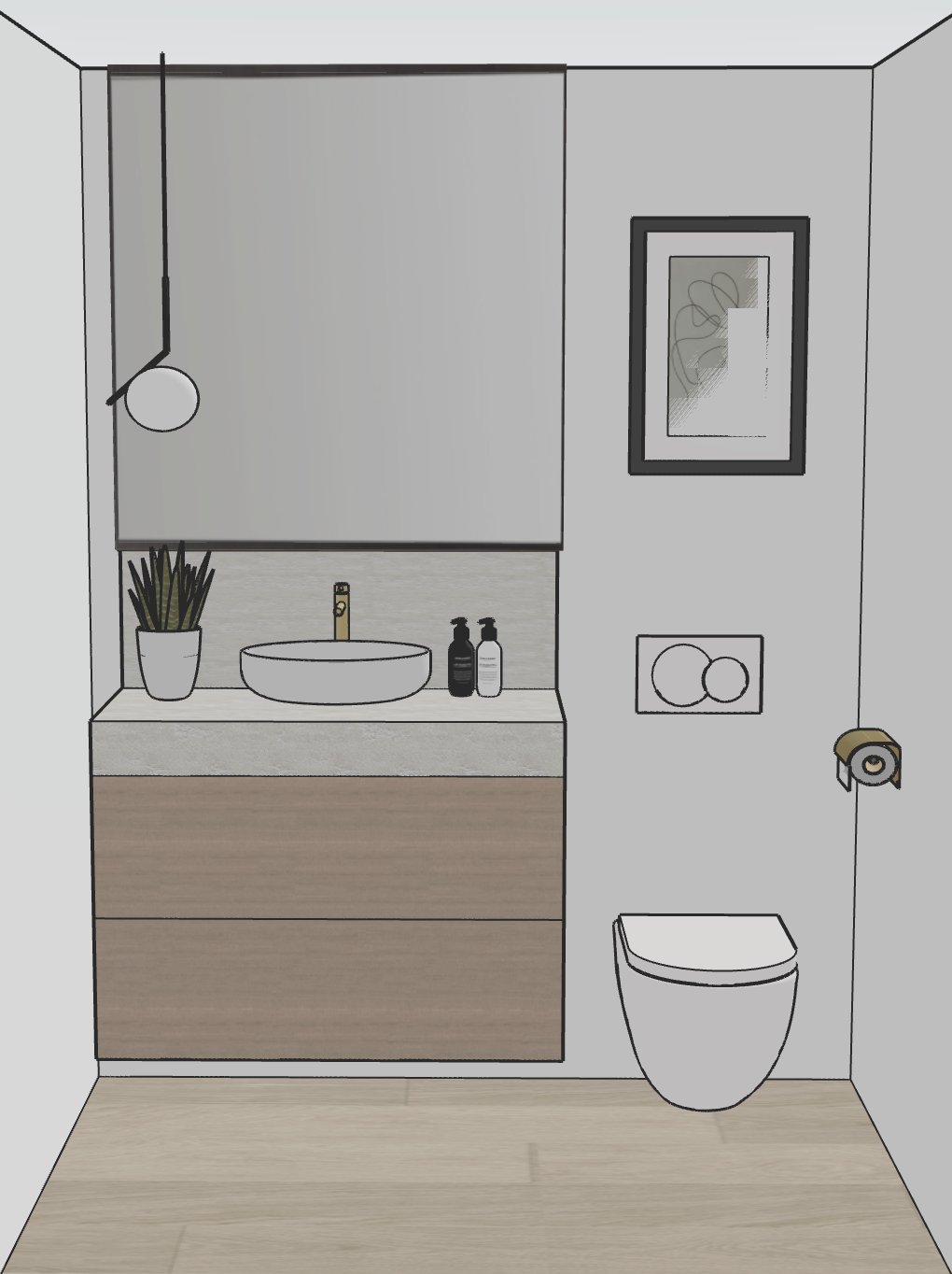 luxury modern contemporary water closet neutral flooring flat panel cabinetry light beige grey travertine countertop brushed gold faucet black modern pendant light minimalist decor lighting under mirror lighting under vanity