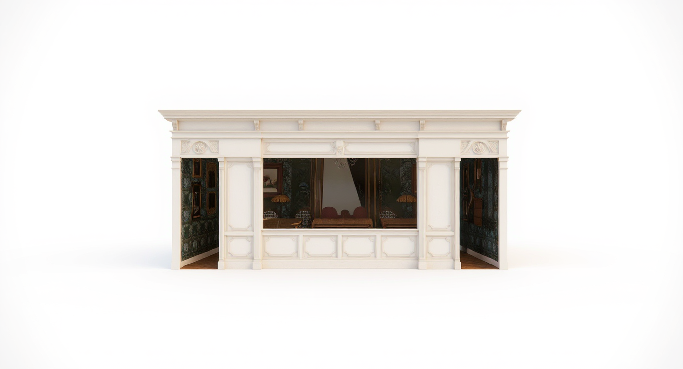 place a victorian style window into the center opening do not change anything else leave the structure on a white background with no shadows