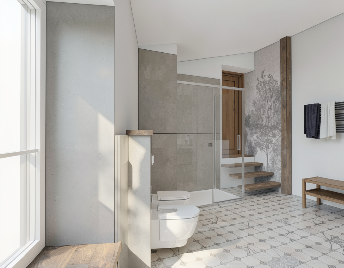 the glass parts will be frosted glass up to halfway from the floor to the ceiling
