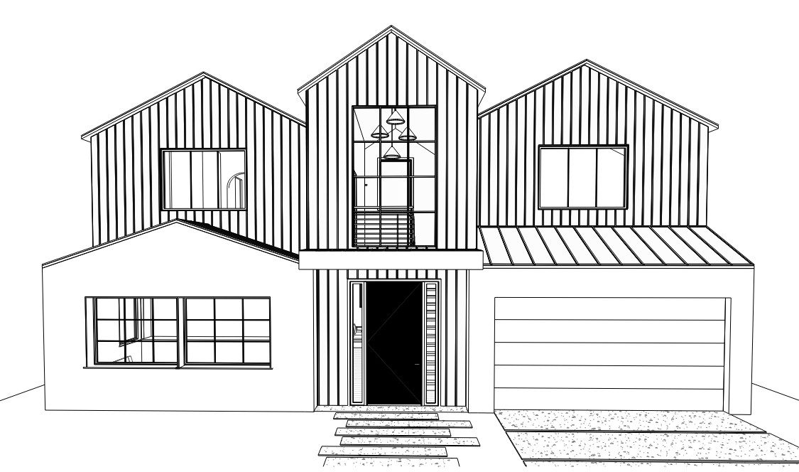 contemporary exterior shot a modern farmhouse with a stunning minimalistic architectural design featuring vertical wood siding painted in a soft off white color the roof is composed of sleek modern metal panels in a dark gray large windows with black frames add contrast and sophistication the front door is a bold contemporary design in matte black the surrounding landscape includes a well manicured lawn with stepping stones leading to the entrance set against a clear blue sky the atmosphere is warm and inviting capturing the essence of a serene suburban setting architecture