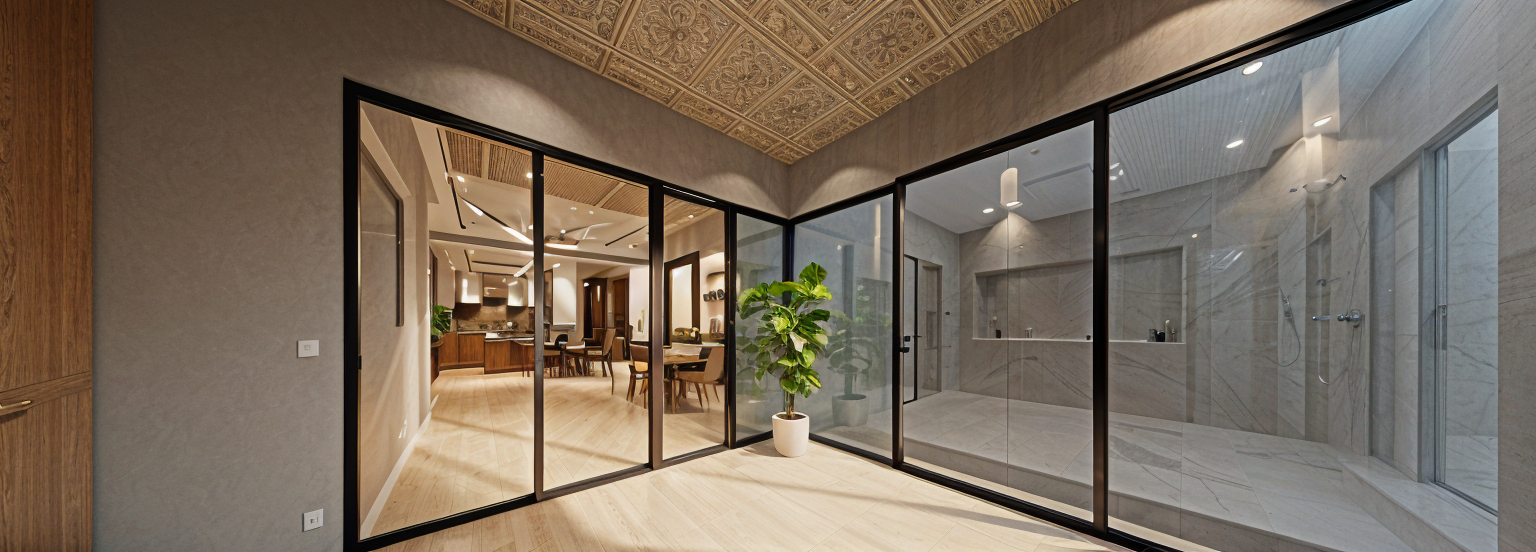 rerender this building closeup image and make it look like a professional exterior rendering do not alter the geometry and shapes only enhance the textures and lighting so it looks more realistic like a high end residential complex in dubai use a light beige stone texture for the slab edges and a warm oak texture for the soffits make the railings and the facade mullions a nice champagne color improve the glass texture