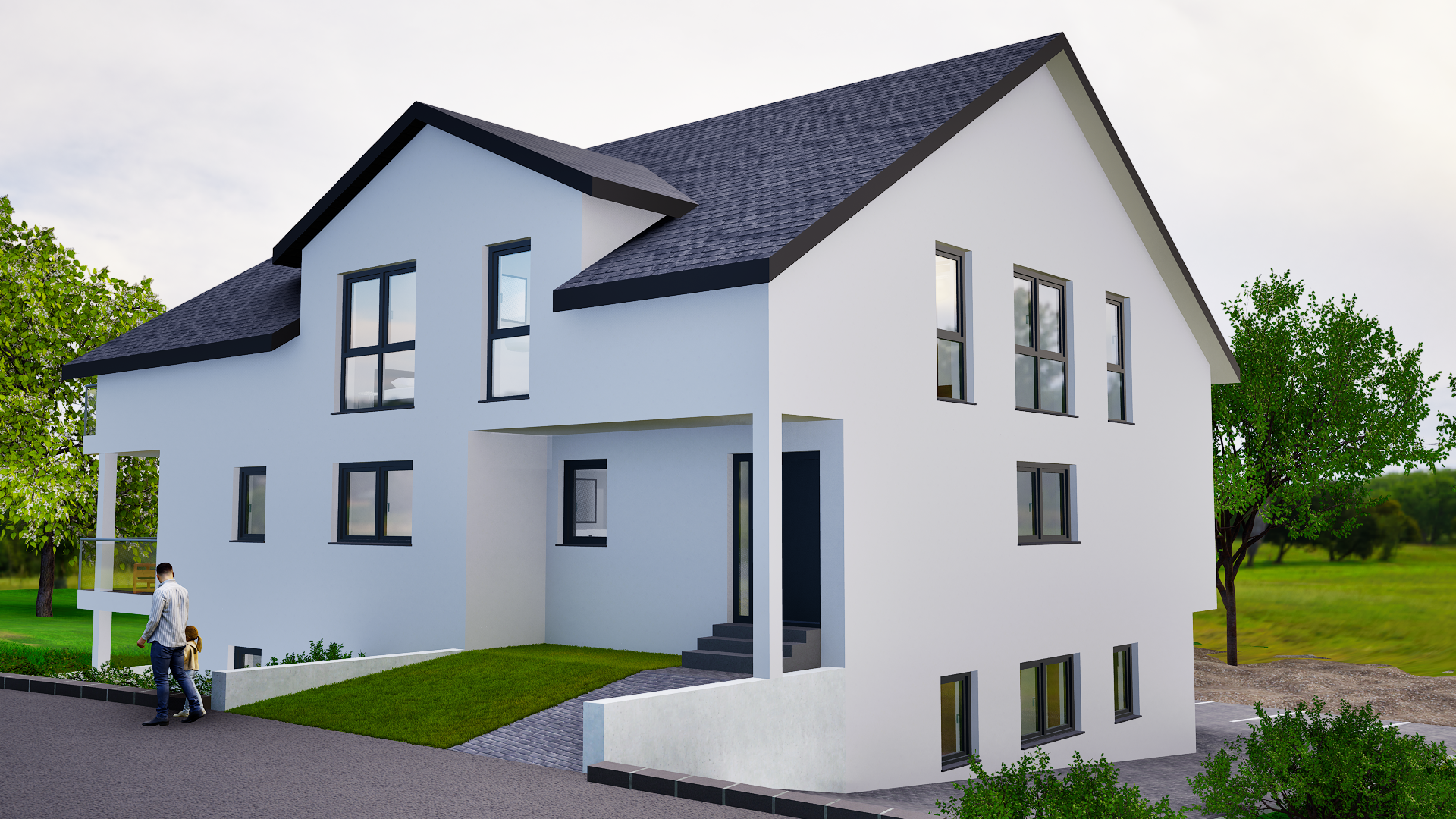 auf der rechten geb udeseite die fensterrahmen bitte in dunkler farbe ral 7016