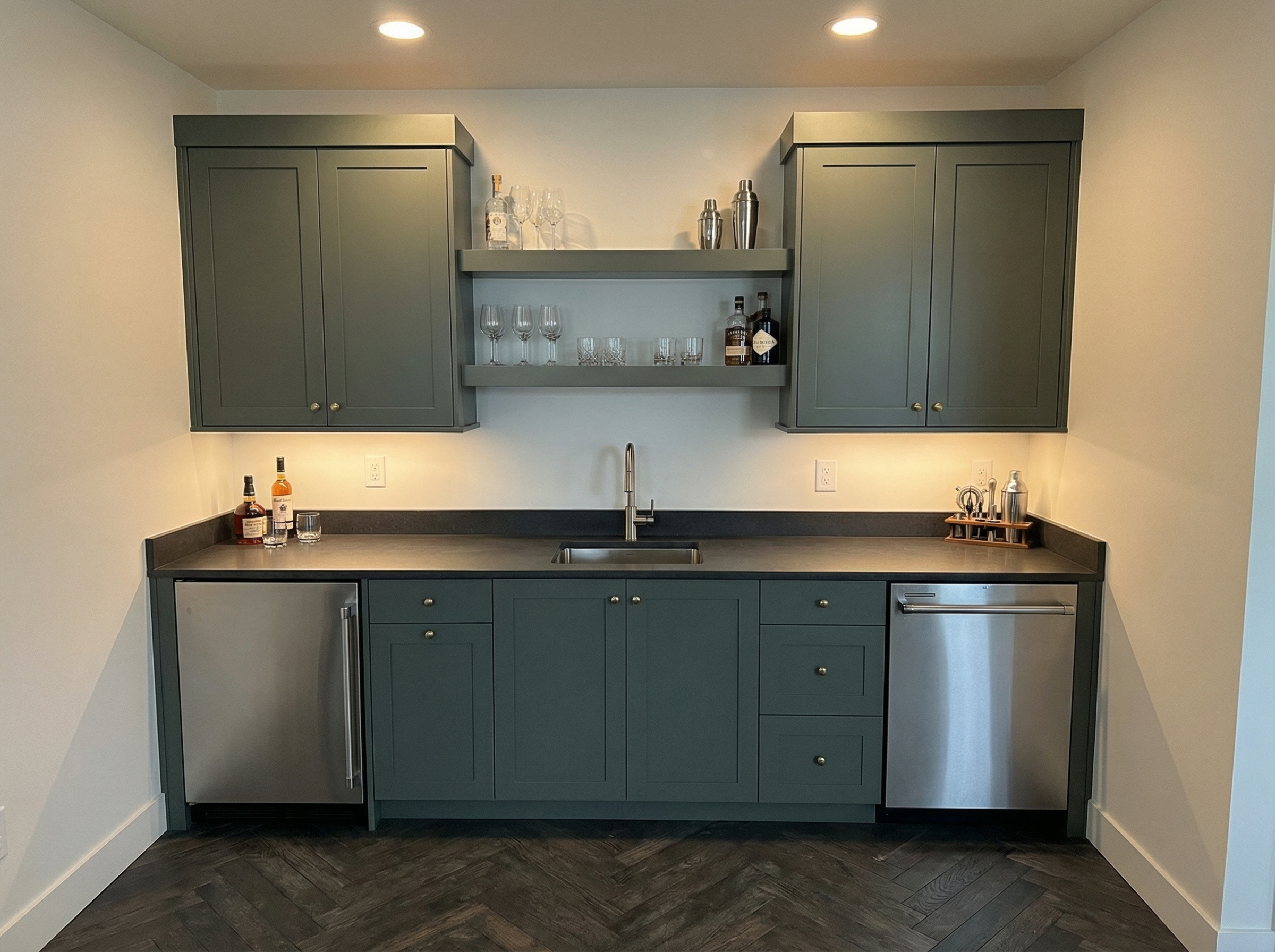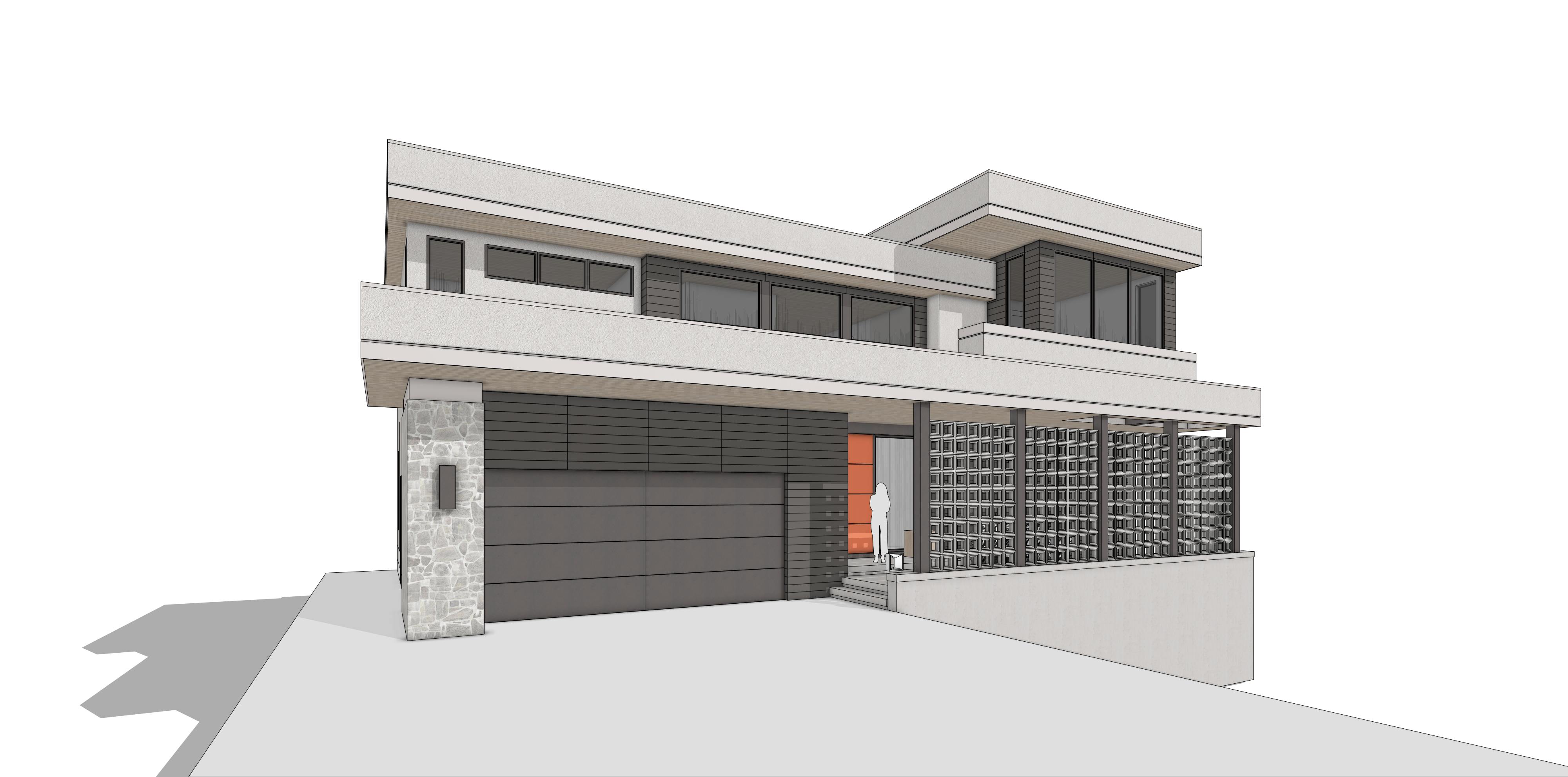 render a photorealistic 3d perspective of this contemporary mid century modern house in a calgary canada reference the current material style just enhance them light stucco extended overhangs with light wood soffits dark horizontal boarding natural fond du lac stone with white grout keep model geometry the same windows doors roof walls garage door pavement driveway make a lush vegetation that looks native to calgary alberta do not change the view only enhance the current materials and make the landscape nicer vegetation detailed textures in the wood siding and glass reflections and a vibrant clear sky with natural light but not too bright atmospheric depth render in hyper realistic architectural visualization quality 8k resolution