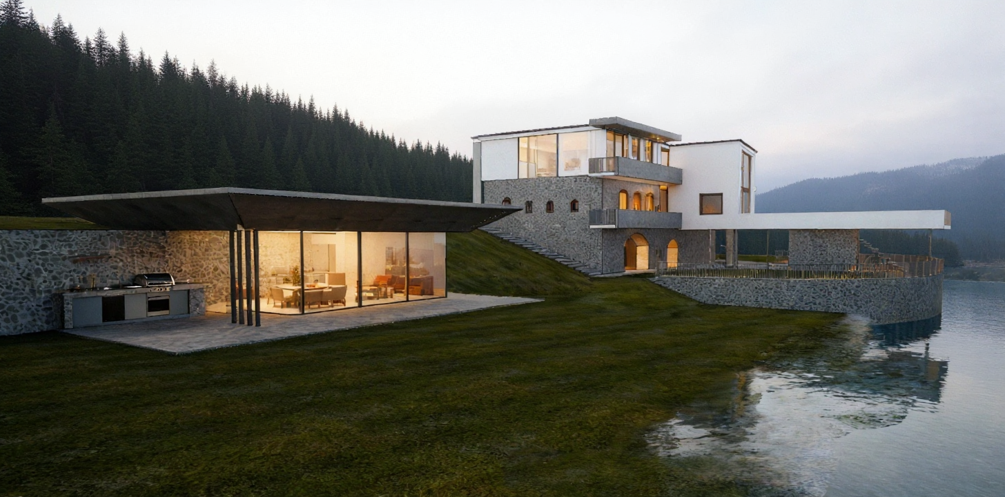 house surrounded by greenery overlooking the lake large transparent windows with furnishings inside outdoor kitchen on the stone wall