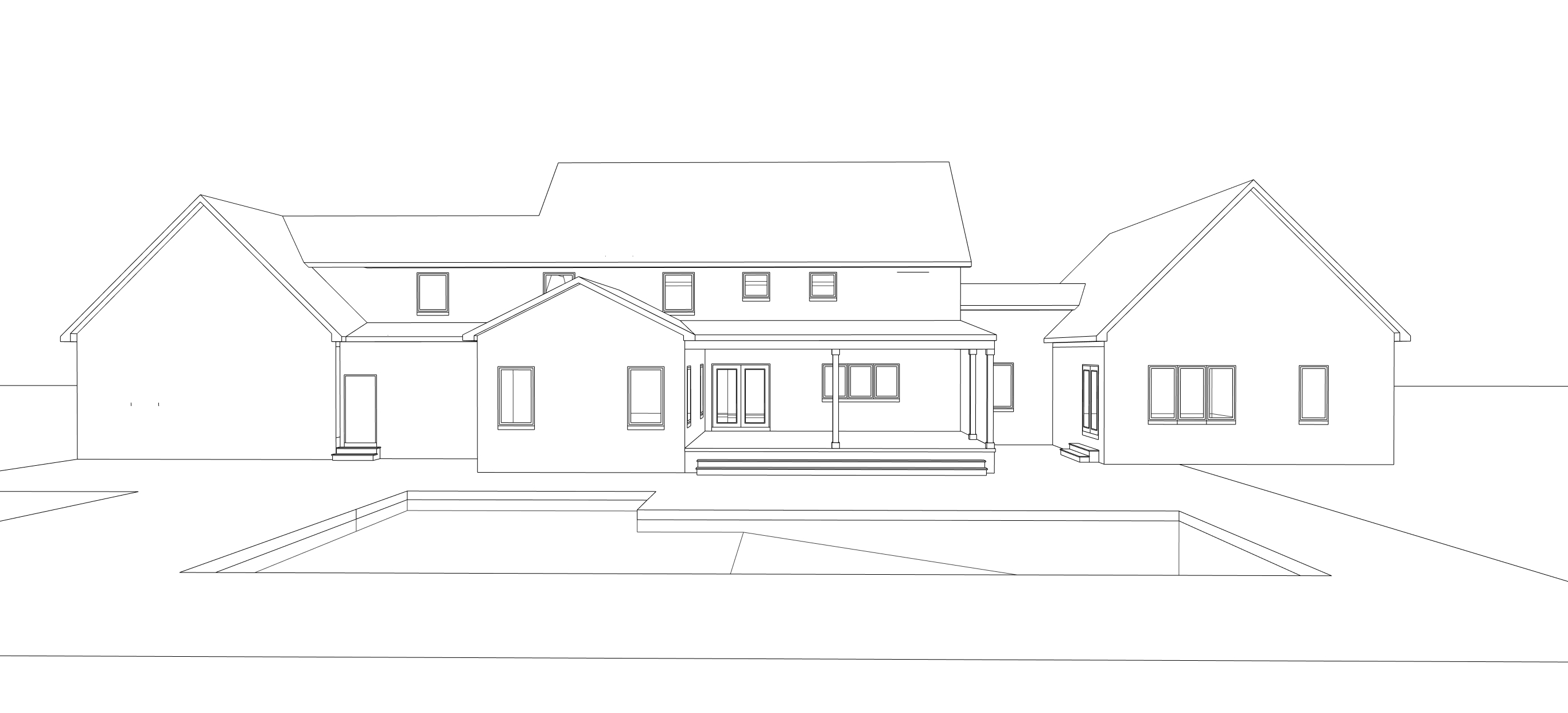 black metal fence around pool make realistic add landscaping red brick white windows white porch posts no windows on left gable