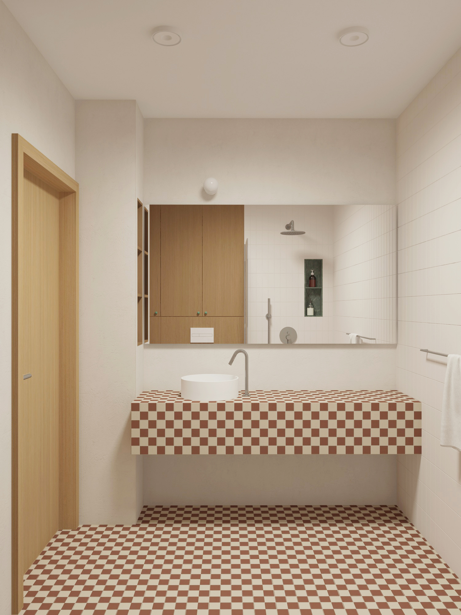 do not modify the original model geometry proportions layout structure or placement of any elements keep the exact same architecture forms and design do not alter or redesign any objects in the scene only improve the materials textures and surface details to achieve a significantly more realistic result enhance material accuracy using physically correct textures proper roughness values reflections bump normal maps and subtle surface imperfections maintain the original material intent while improving realism the scene is illuminated by ceiling lighting the lighting should feel natural and believable with realistic light intensity soft shadows accurate reflections and balanced exposure improve global illumination and realistic light interaction with all materials focus on high end photorealism through refined material definition realistic reflections subtle imperfections and natural color grading without changing the model geometry layout or design in any way colour balans is neutral the tile colour is beige