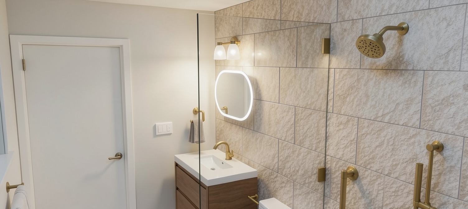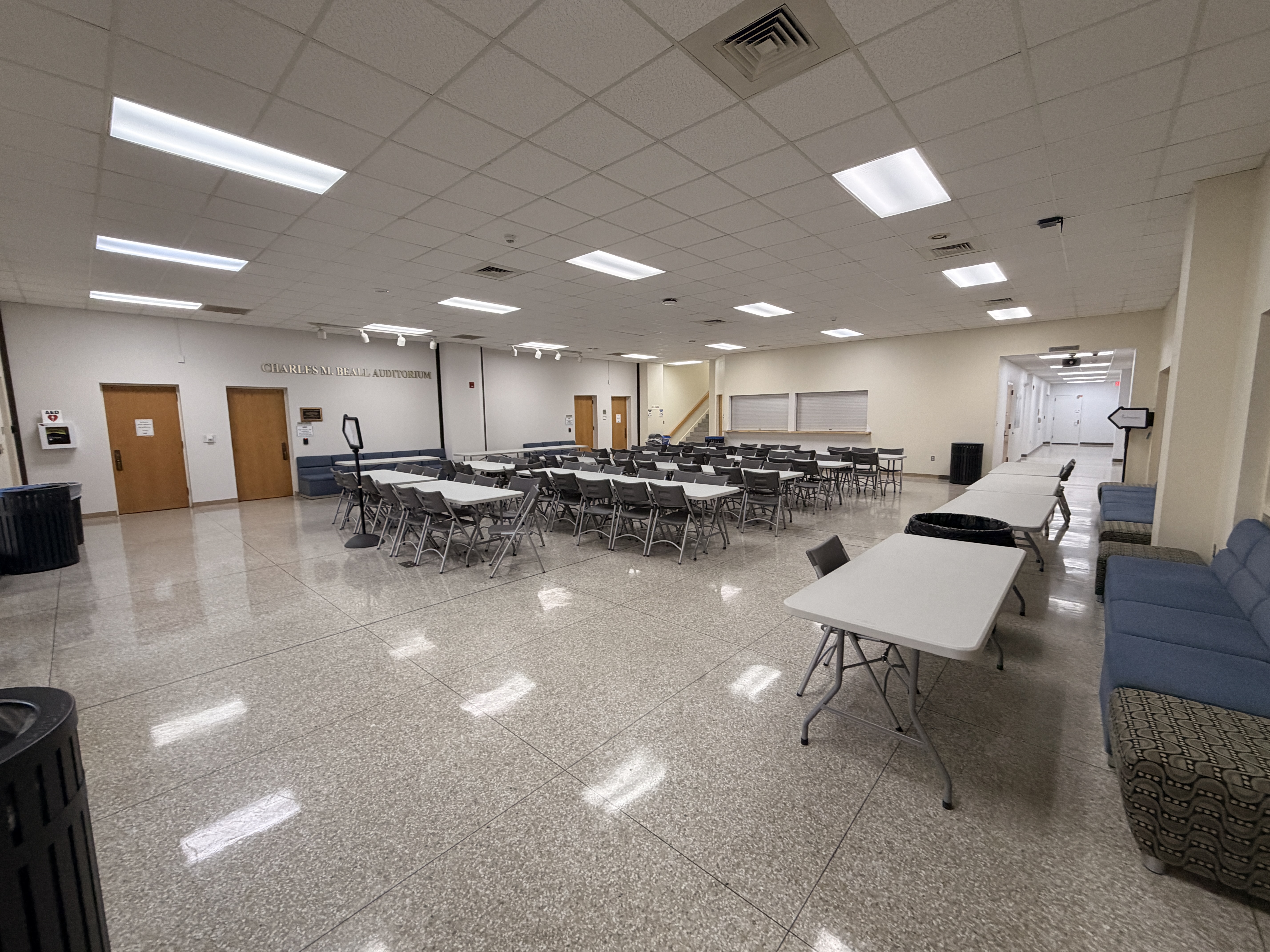 stylize this space to represent a collegiate auditorium lobby space the doors enter into a perfomance art auditorium remove the furniture in the middle of the photo the window openings are for a concession stand the hallway in the upper right corner goes to the restrooms
