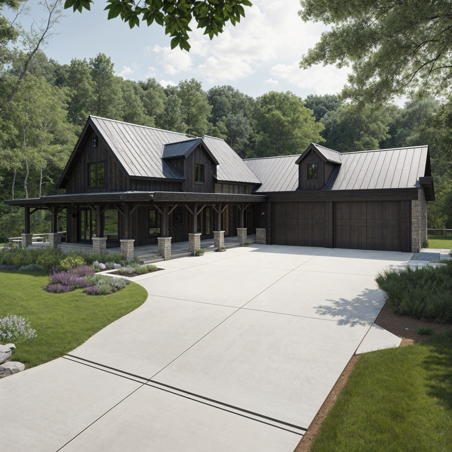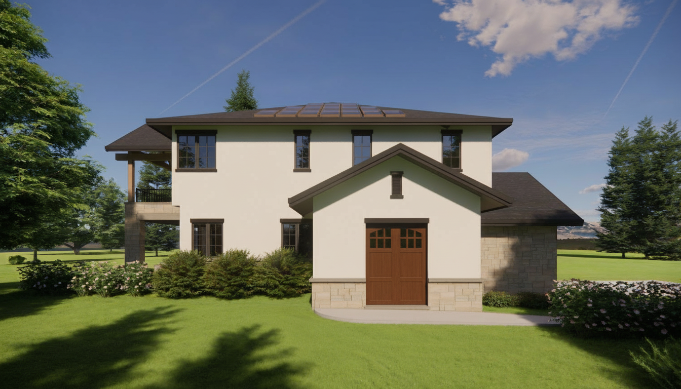 render a serene countryside landscape featuring a vibrant green forest of pine and oak trees the houses blend harmoniously with the surroundings featuring warm toned earthy stucco walls and red clay tile roofs the road is smooth and dark asphalt bordered by natural stone walls in a light gray hue sunlit ambience casts soft golden daylight across the foliage creating an inviting and peaceful atmosphere the distant hills are lush and rolling casting gentle shadows while the sky is a clear blue with a few fluffy white clouds enhancing the tranquil scenic view architecture