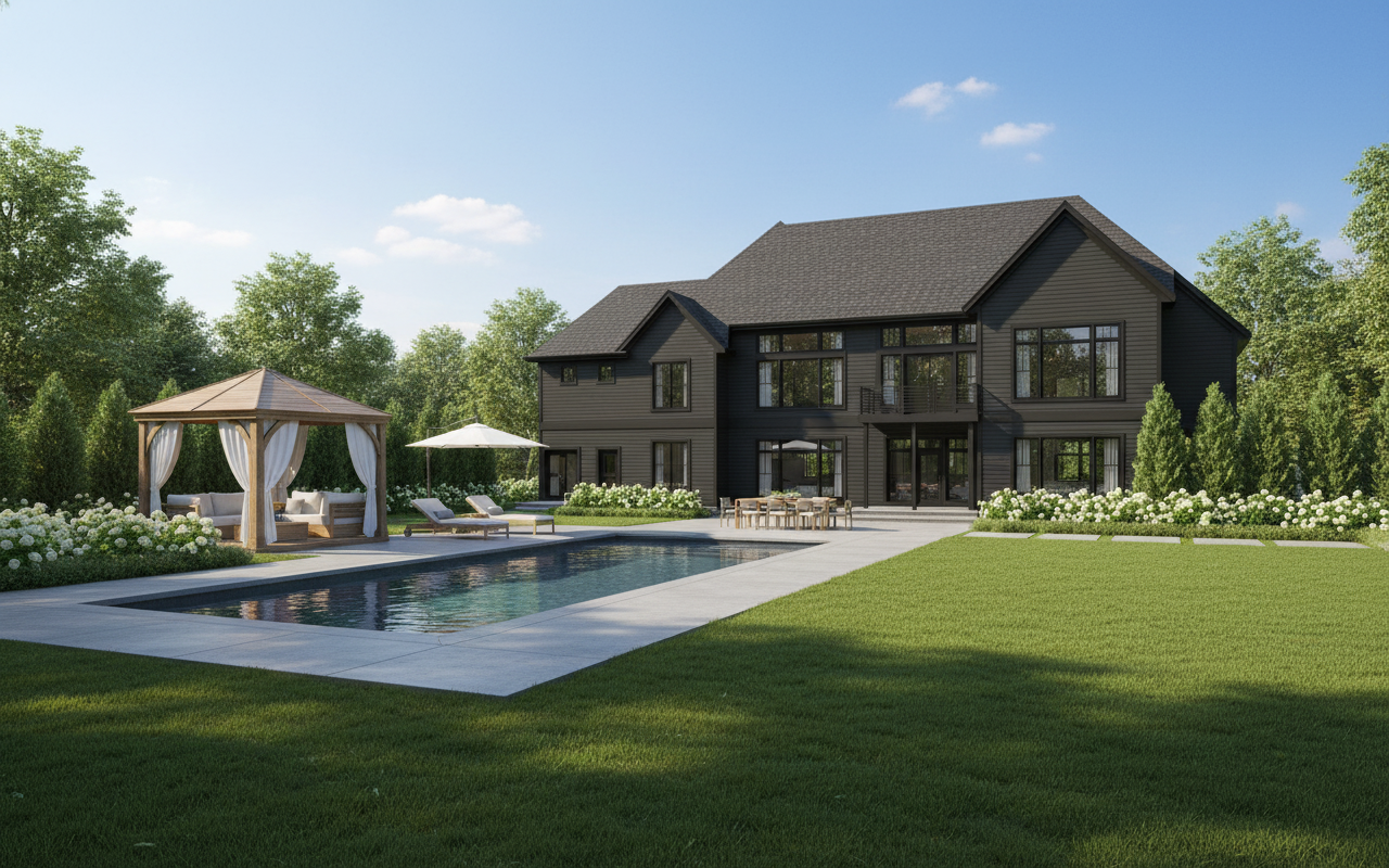 must add a riverpools x36 model pool cedar gazebo with curtains add outdoor furniture make the siding black paint colored no stone or brick on the house black windows do not change the layout add landscaping zoom out far to show landscaping and house make the deck all brushed concrete not too much concrete add dining table and chairs add lounge chairs and a white umbrella no steps put the gazebo to the left make it look fancy show it at night with outdoor lighting