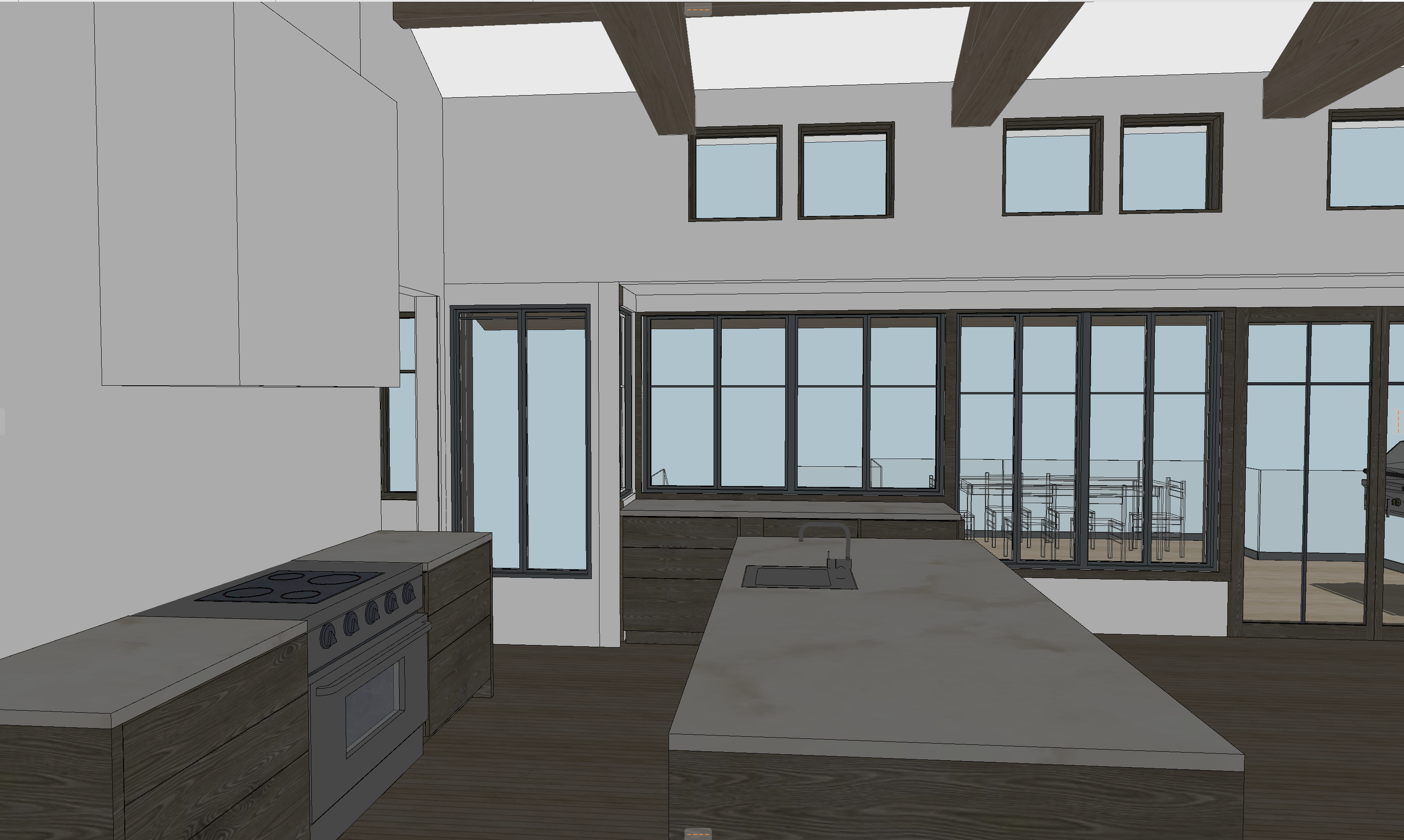 rolling hills grassy wyoming landscape in background enhanced interior lighting plater walls and range hood glass deck railing