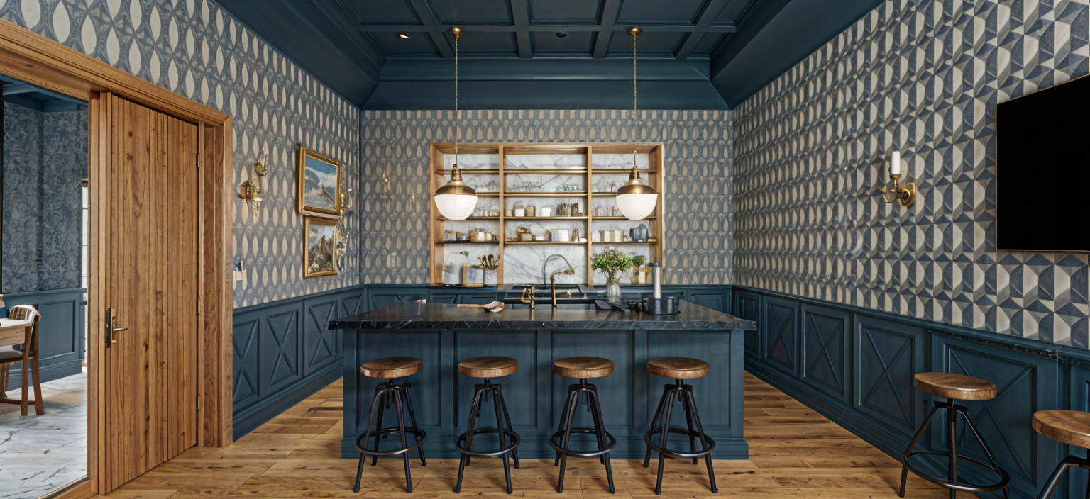 interior shot ceiling high gloss paint movie room velvet blue seating fabric moody lighting bean bags architecture