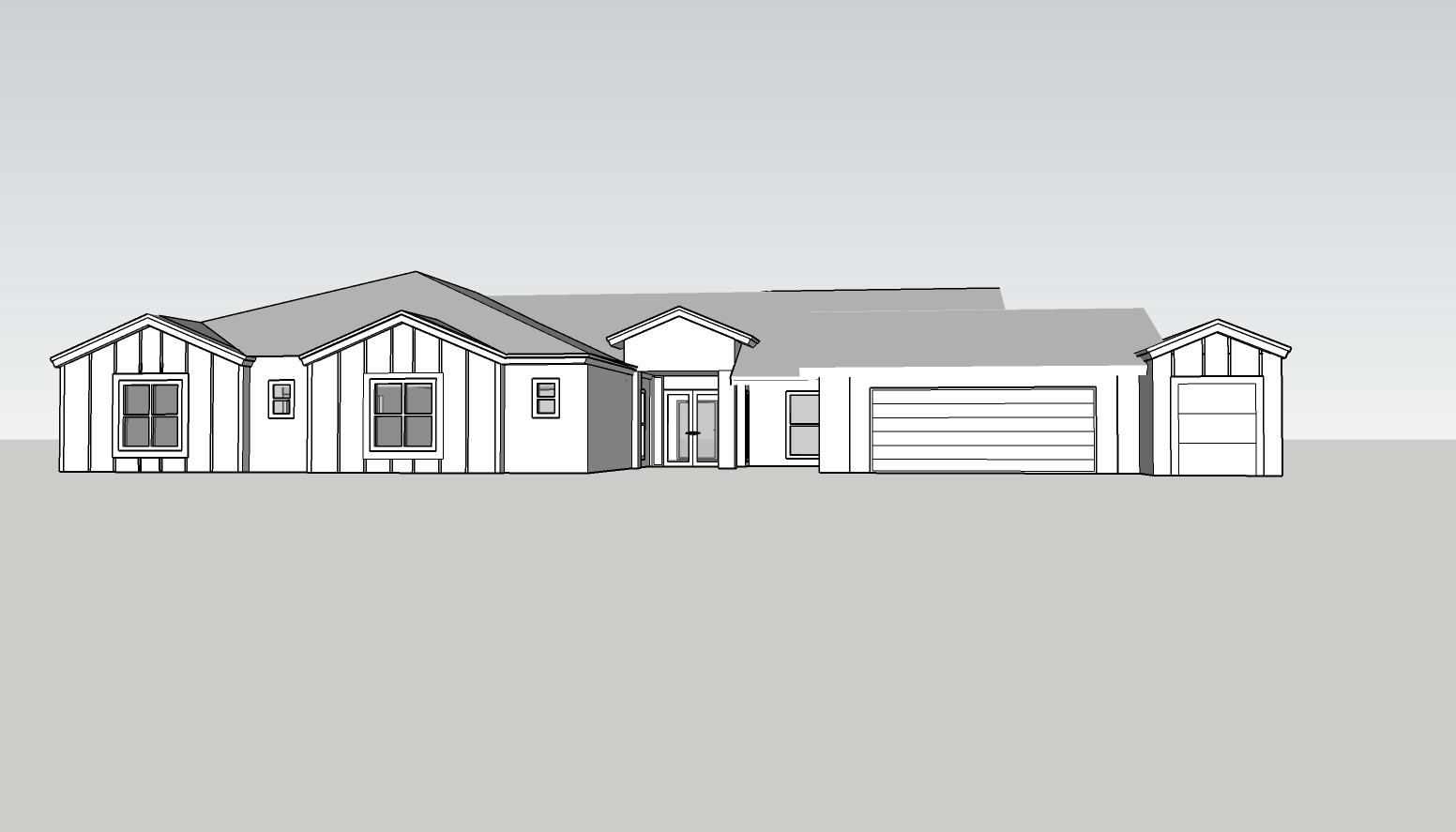 modern farmhouse with white walls vertical siding dark roof dark window and door frames florida palm trees beautiful landscape modern 4 x4 concrete driveway with 3 green turf in between