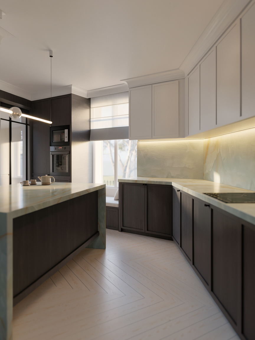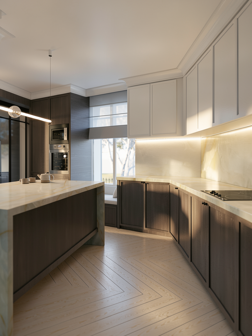 ultra photorealistic modern minimalist kitchen interior keep the exact same layout camera angle framing and design as the reference image matte beige handleless flat panel cabinets with clean vertical divisions full length marble backsplash with subtle grey veining marble countertop light oak wood island base waterfall marble island edges integrated black induction cooktop neutral light stone floor tiles make the render more seamless and realistic with high end architectural photography quality perfect geometry alignment consistent cabinet gaps 2 3mm realistic shadow lines accurate scale clean joinery and corner detailing add subtle real world imperfections soft micro texture on painted cabinets slightly varied roughness gentle fingerprints and smudges on the marble and cooktop faint edge wear on cabinet corners realistic grout lines and tiny speckles in the floor tile natural light bounce and color bleeding lighting warm late afternoon sunlight entering from the left narrow window soft sun patches on the backsplash and island smooth global illumination realistic ambient occlusion warm under cabinet led strip lighting 3000k with soft diffusion and no harsh hotspots subtle recessed linear ceiling led with natural falloff photoreal ray traced reflections physically based materials pbr cinematic tone mapping balanced exposure realistic white balance sharp focus 4k interior photography no artificial cgi look