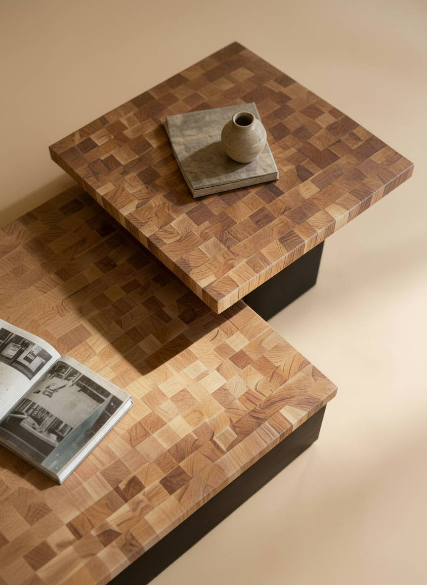 ultra realistic close up photograph of an end grain wood surface captured as an abstract composition the material must remain exactly as in the table same tones same pattern no modifications composition the frame shows only a portion of the surface cropped asymmetrically the pattern is not centered cut through the frame in a dynamic way a slight diagonal orientation creates visual movement no table edges no base no full object visible lighting soft even natural light consistent with a high end interior shoot no dramatic shadows background none the wood fills the frame camera 50 70mm lens feel sharp minimal depth of field mood abstract tactile architectural negative prompts no objects no full table no blocks no styling no symmetry no cgi look