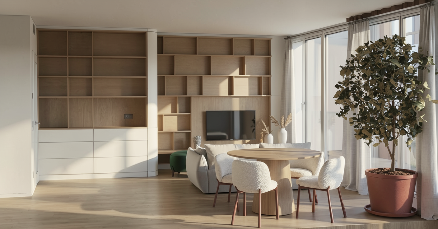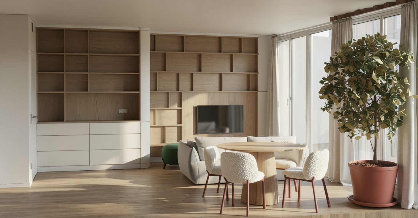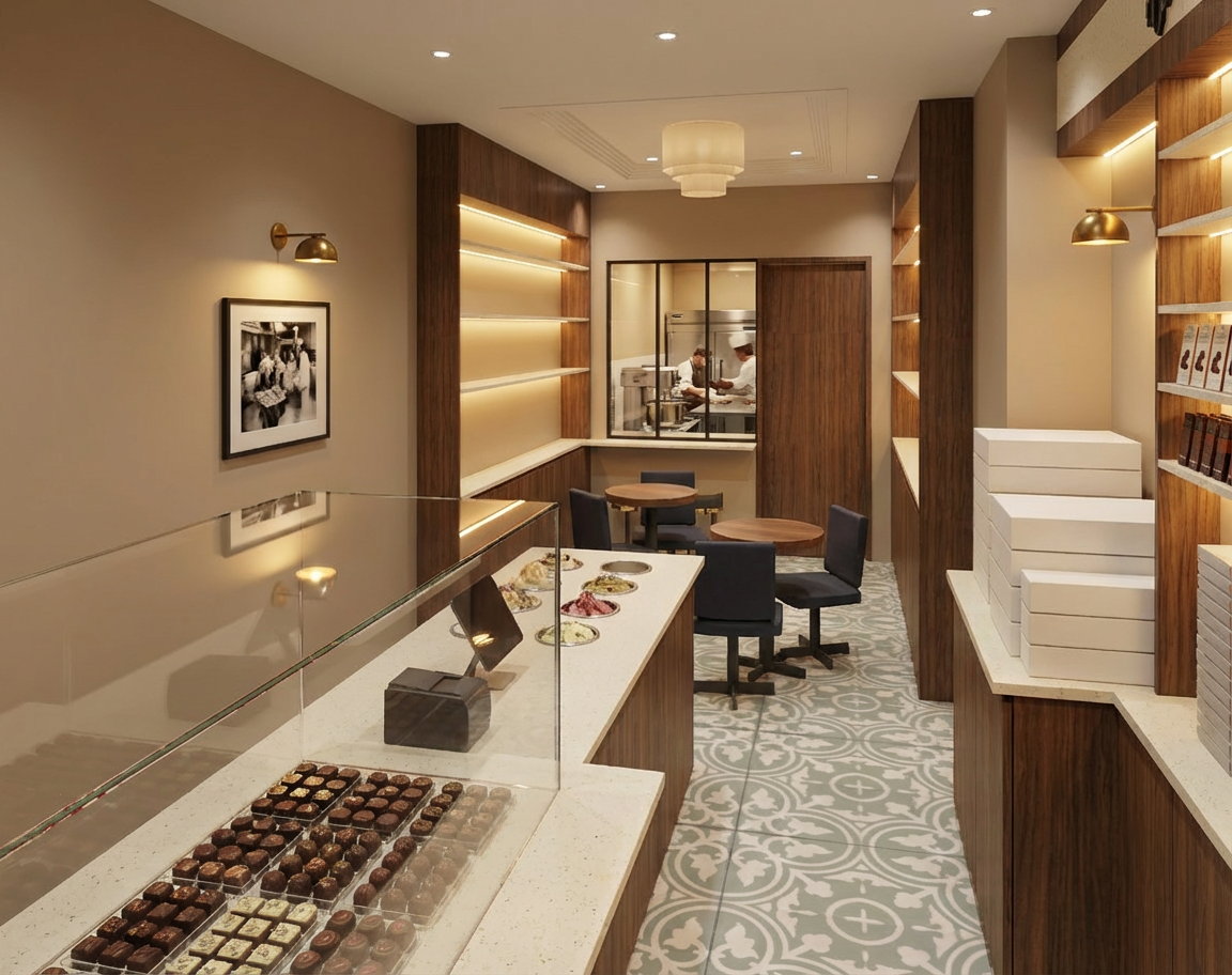 keep image exactly the same don t add or remove anything just make 8k high quality photorealistic render of a chic chocolate shop interior features sophisticated walnut timber joinery and a ivory cream subtly speckled benchtops and shelves large glass viewing window at the rear looking into the production area for customers to see in and a solid door on the right two french style small tables and french style chairs chandelier at the rear of the store in a recessed ceiling with led strip lighting wrapping the recessed ceiling led strip lightings to all shelves 1 wall light is brushed antique gold emitting a warm white glow for an inviting atmosphere with black and white photo underneath the internal walls are painted in a brown toned white colour the internal floor is a tesselated tile with pale green and white patterns there is a large bon bon chocolate glass cabinet on top of the benchtop and gelato one the right of the post machine cold drink maker coffee machine and milk frother on the shelf on the right with chocolates in an upright stacked orientation on the shelves above ambiance is cozy and luxurious suggesting an upscale artisan chocolate boutique
