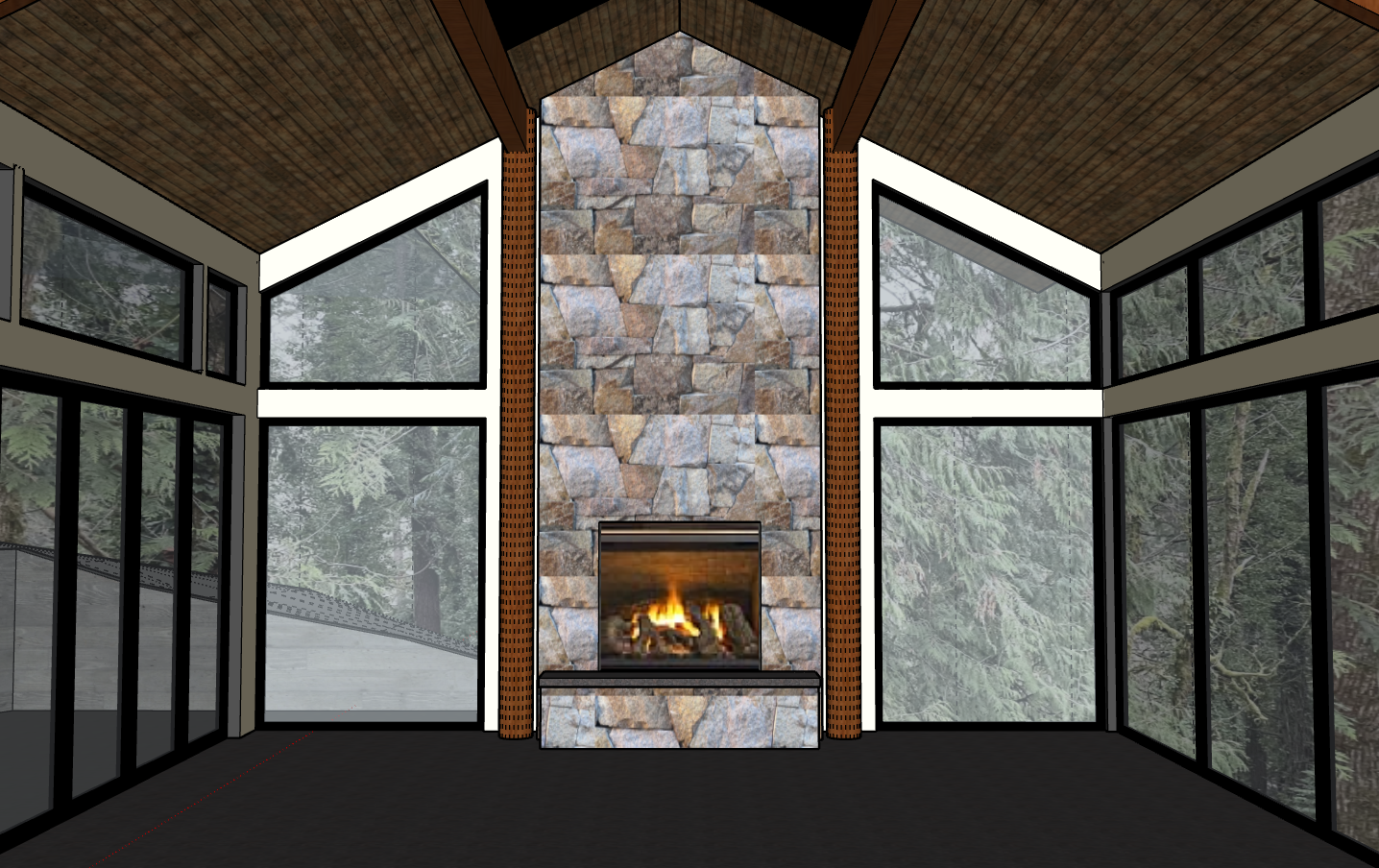 greige white oak herringbone floor keep stone fireplace as is