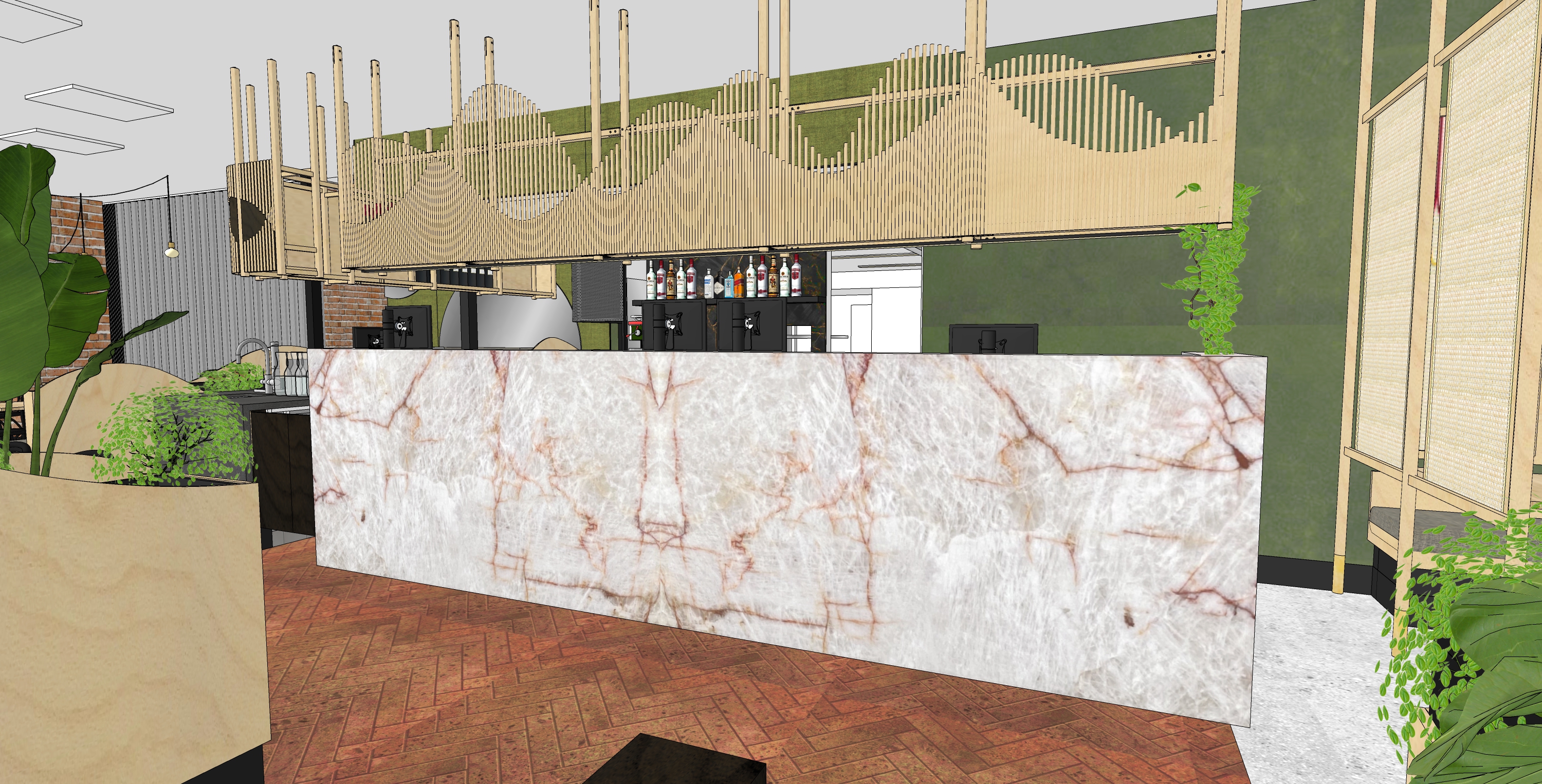 add backlit effect to the front counter the whole vertical stone surface to be backlit with very dimmed down led panel add led strip lighting effect to overhead shelf