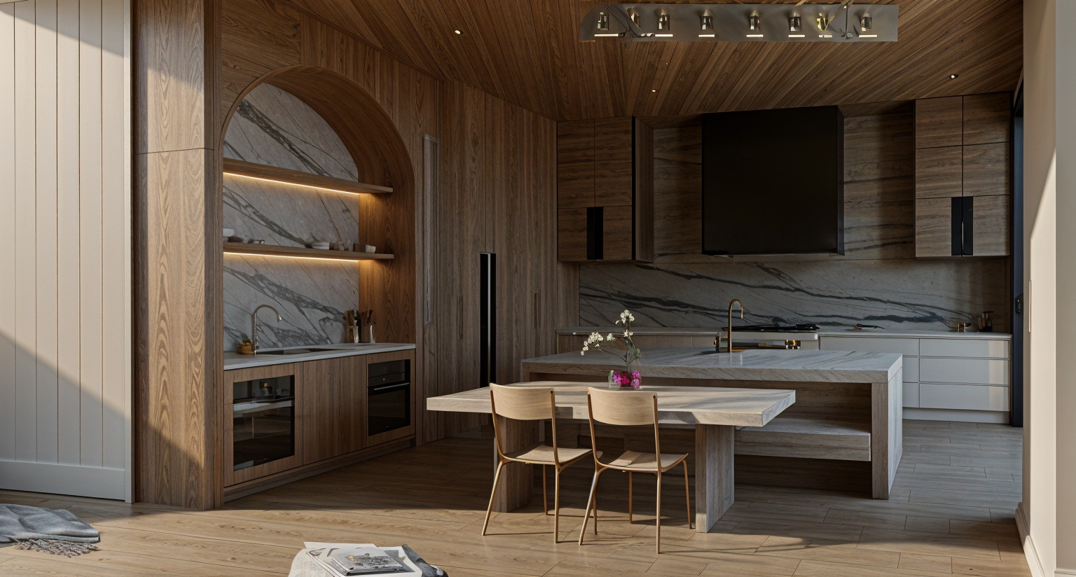 kep the colour pallet the same instead make the wood material lighter add a lake backdrop in the windows add sectional couch