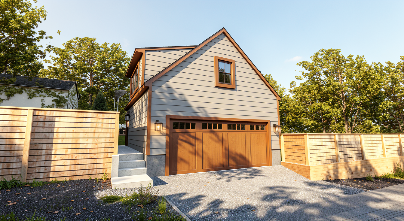 realistic modern warm brown gray wood siding with brown trim light wooden fence sunny
