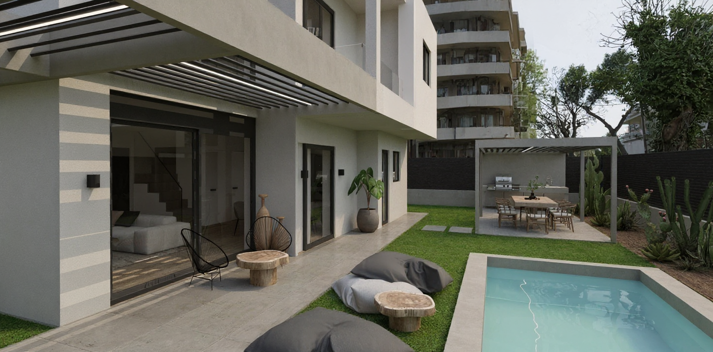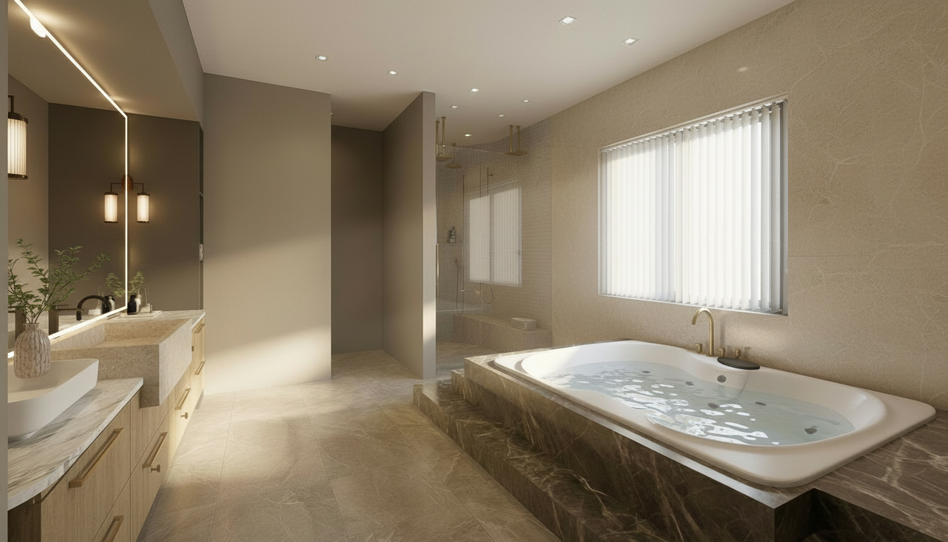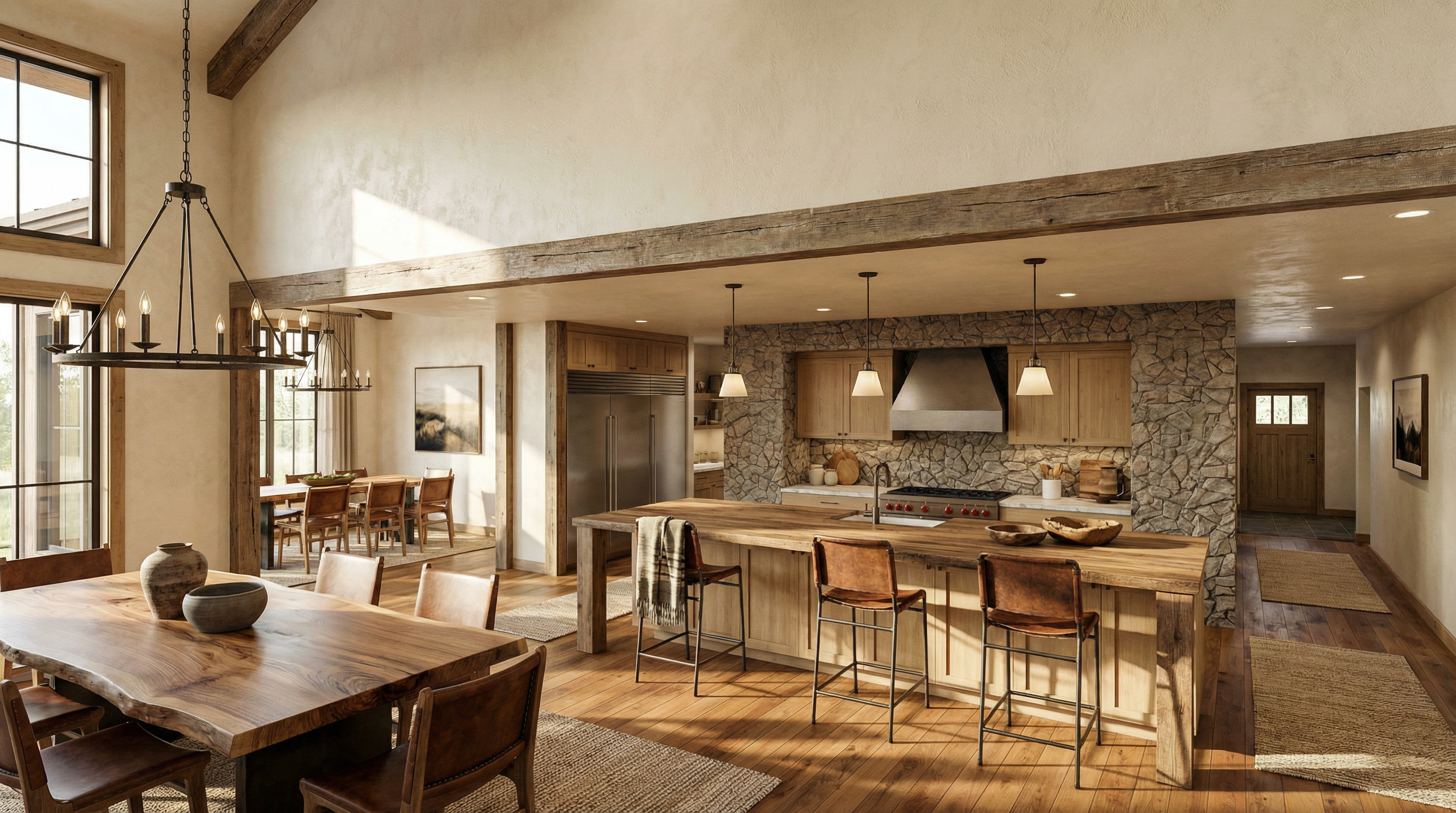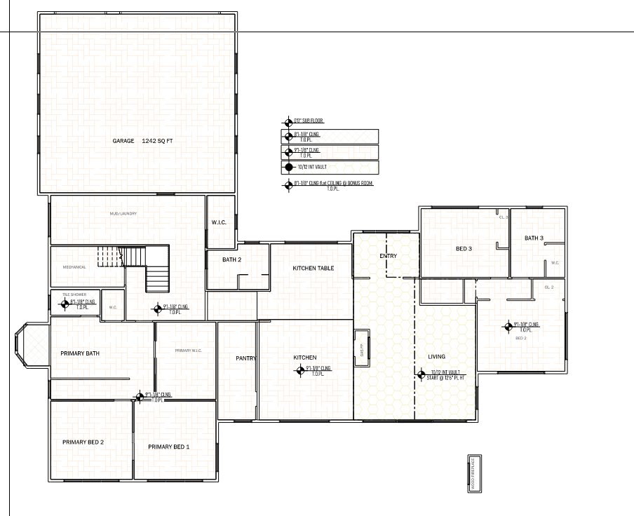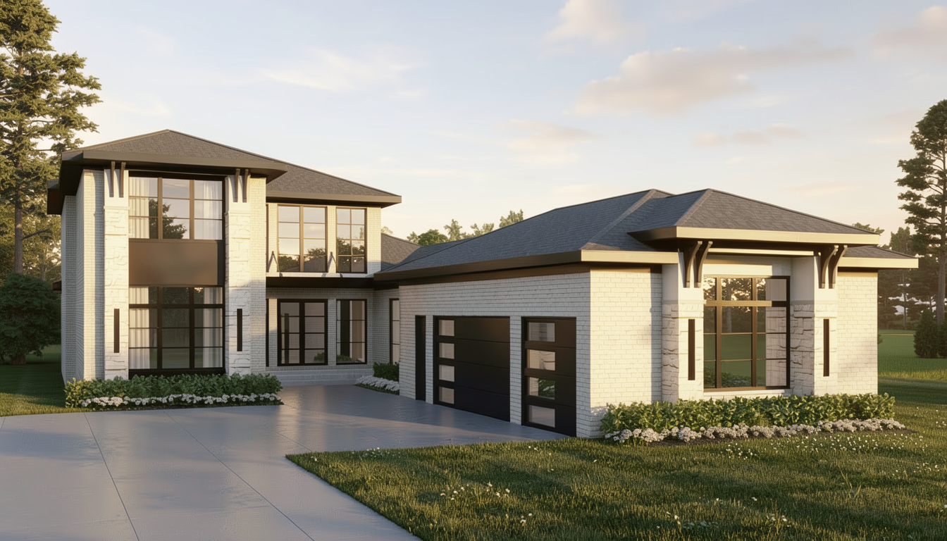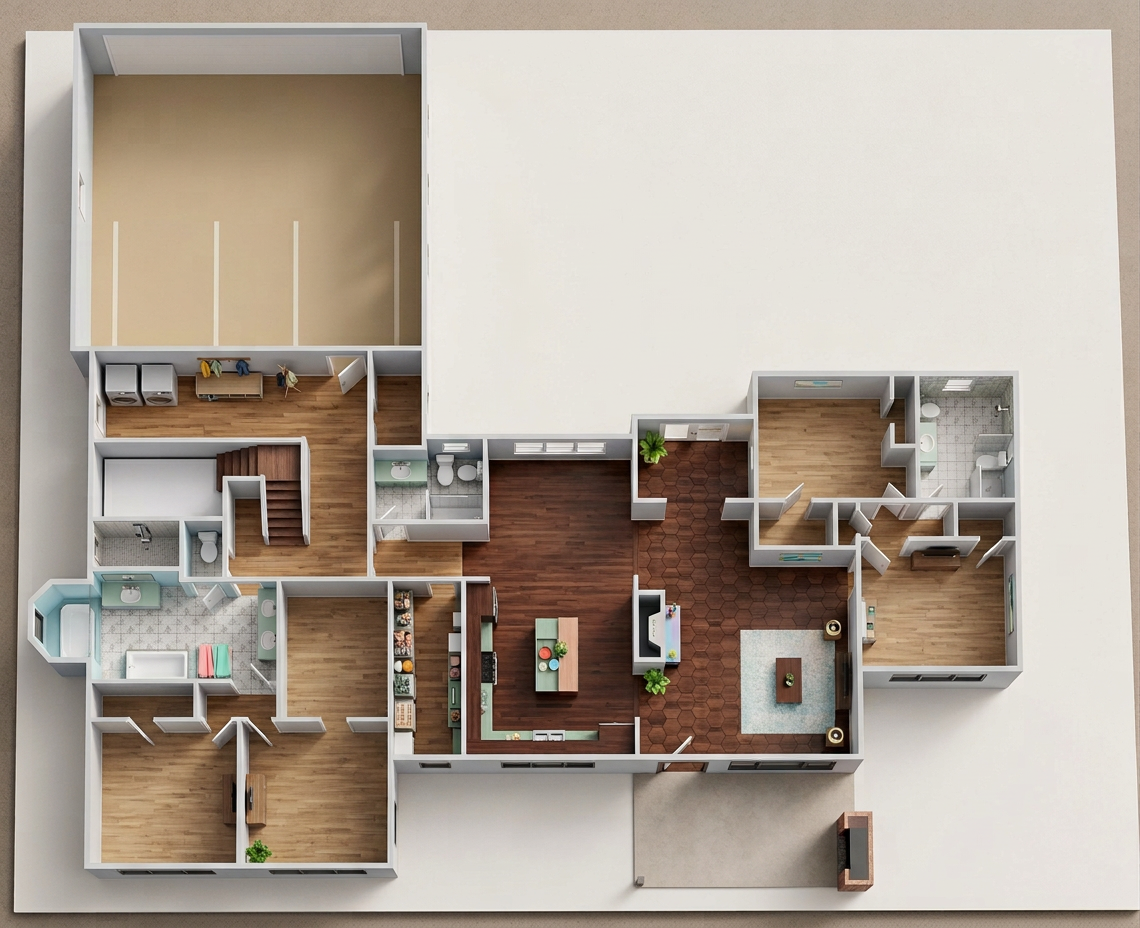convert this floor plan into a realistic isometric 3d view of a full house show the space from an elevated angle with furniture walls and details visible create a beautifully rendered floor plan of a spacious modern house use a soothing palette with soft greys and whites for the walls and layout lines highlight key areas like primary bath kitchen and living using subtle shades of pastel blues and greens render the garage area with warm beige tones to suggest coziness add wooden textures for kitchen table and entry with rich dark brown hues use diffused natural lighting for an inviting atmosphere casting gentle shadows to enhance depth and dimension use the same furniture as shows on the plan do not change the orientation of the floorplan
