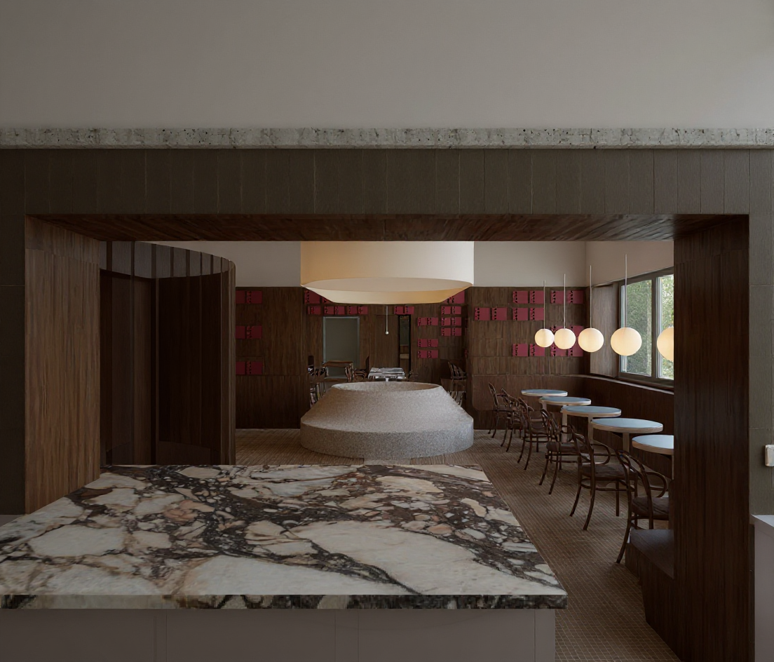 modernist rooftop shot use nature material wood stone concrete coziness and greenery set in the evening with soft gentle sunlight make it a community center make roofs curvy architecture