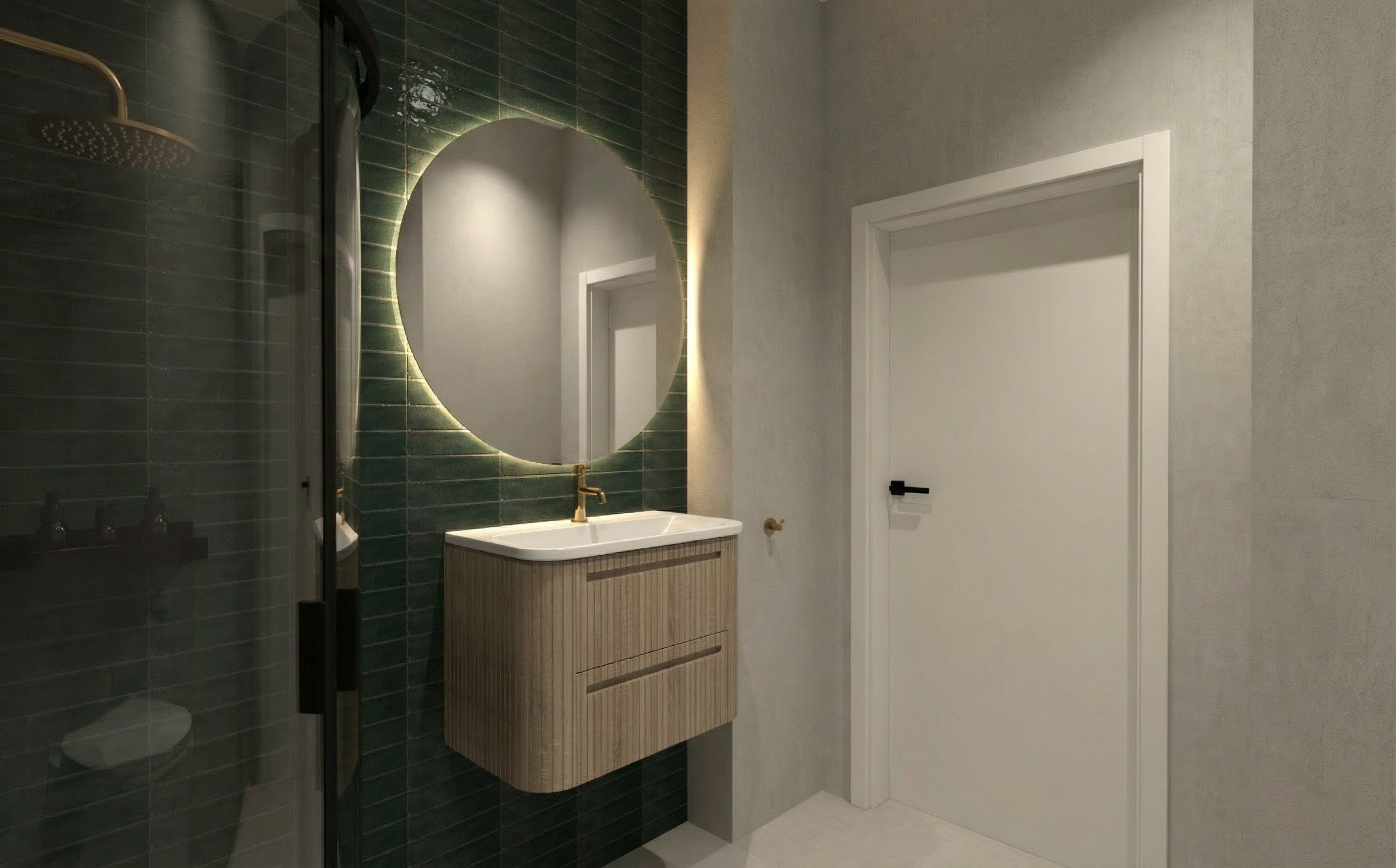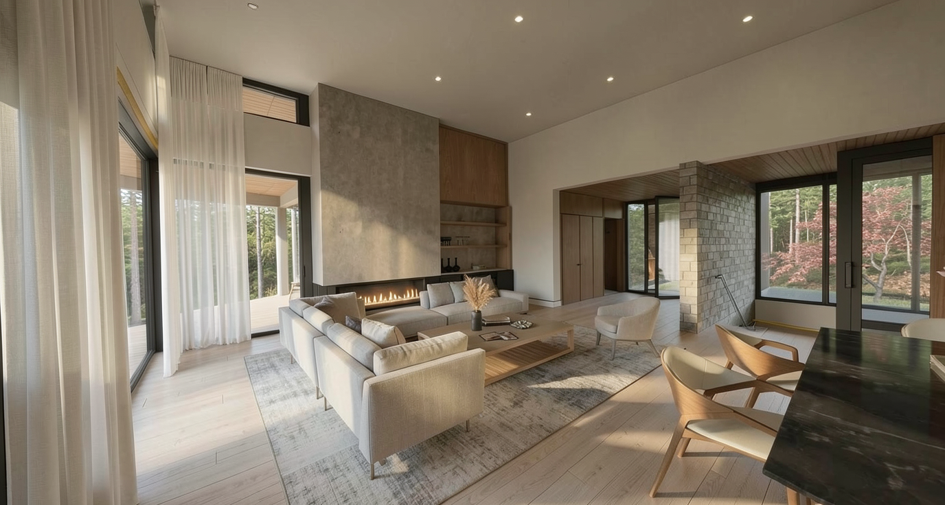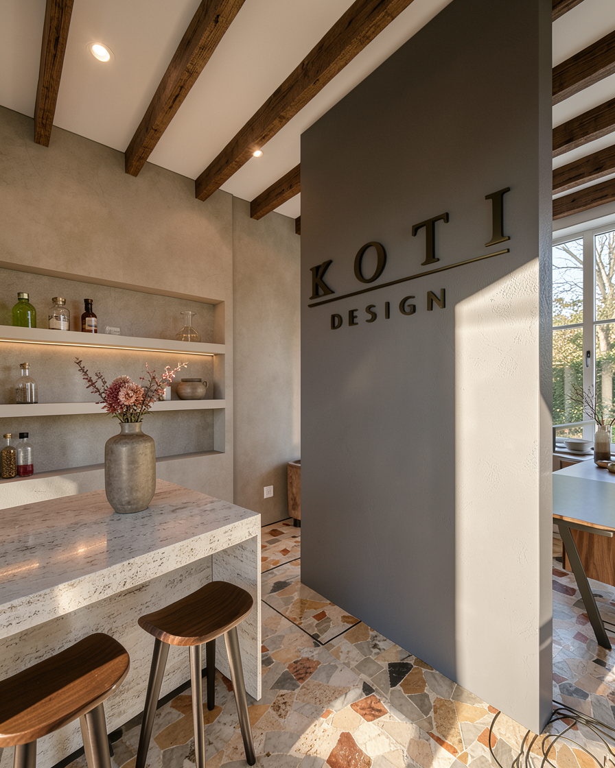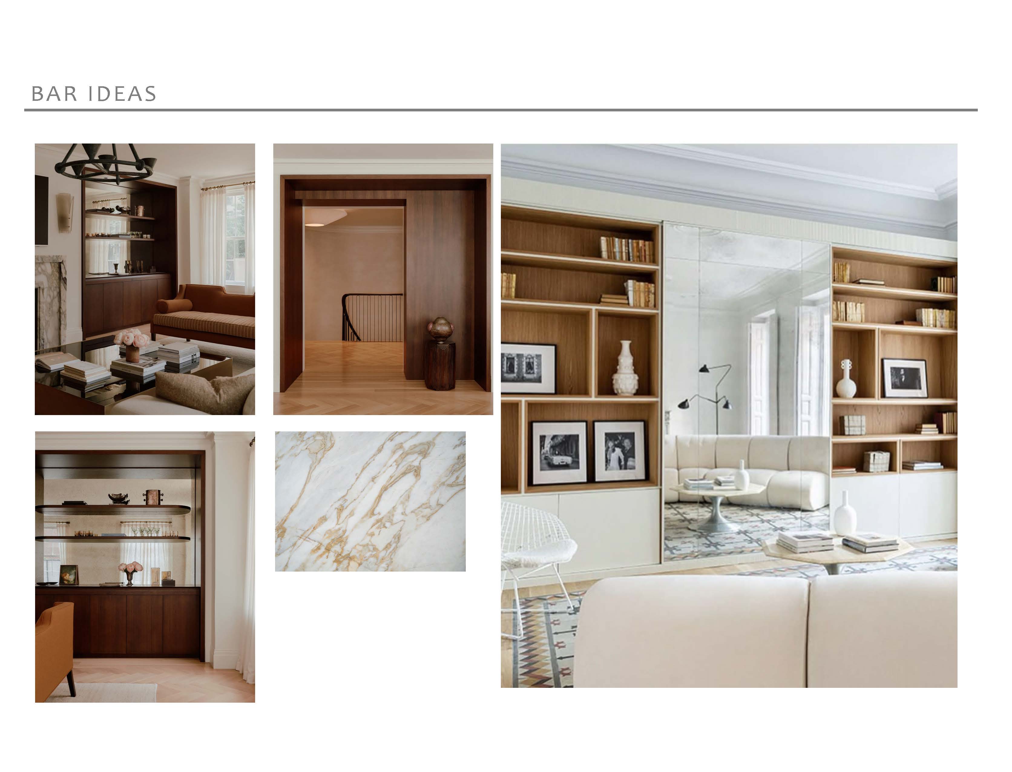 please use the attached mood board images and elevations images to create a rendering of this dining room the millwork and details around the doorway should be the warm wood tone the ceiling should have the navy floral wallpaper and the countertop of the built in should be marble please stage the shelving and lit shelves