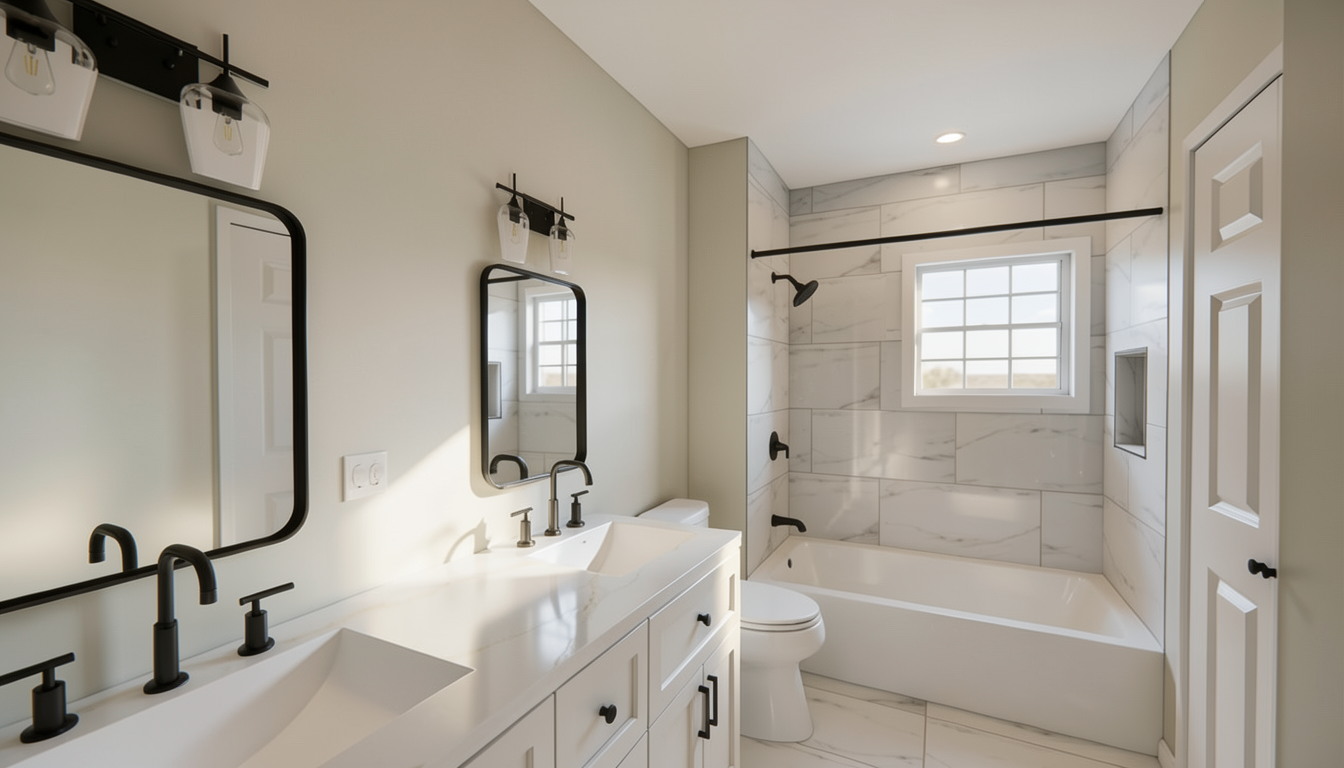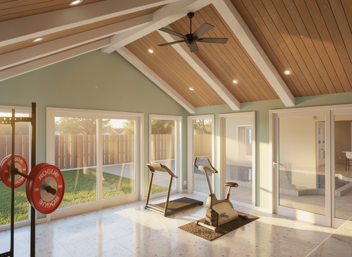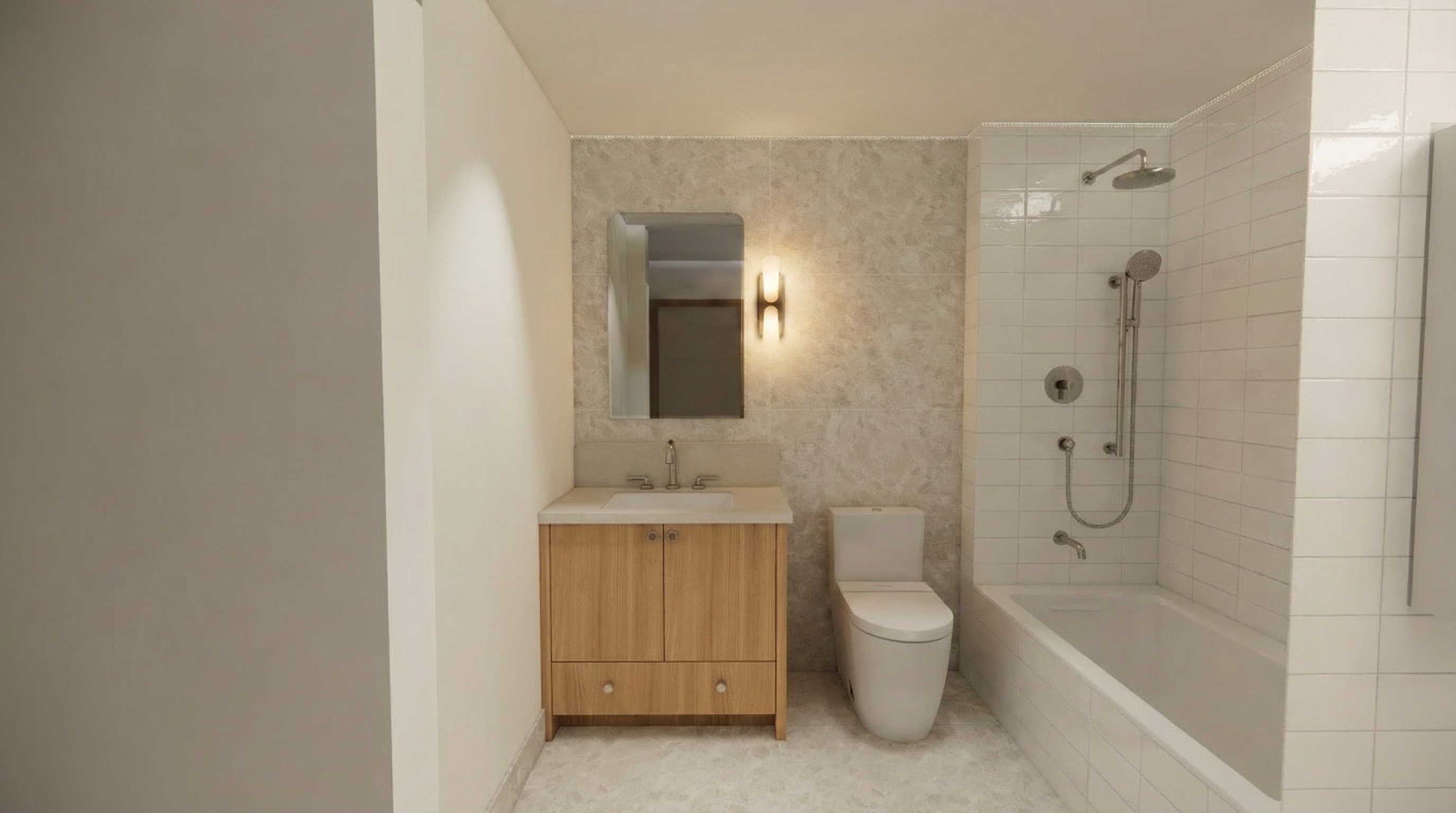 please use the attached mood board images and elevations images to create a rendering of this dining room the millwork and details around the doorway should be the warm wood tone the ceiling should have the navy floral wallpaper and the countertop of the built in should be marble please stage the shelving and lit shelves