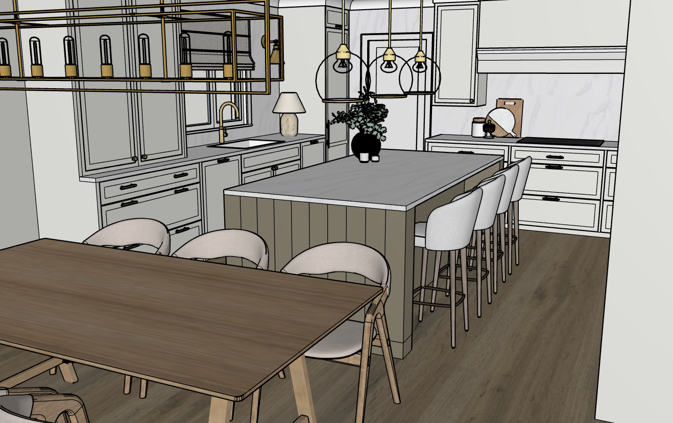 evening sun through window with kitchen island lights on and the dining table light on with led lights in the cooker hood and flush spot lights on