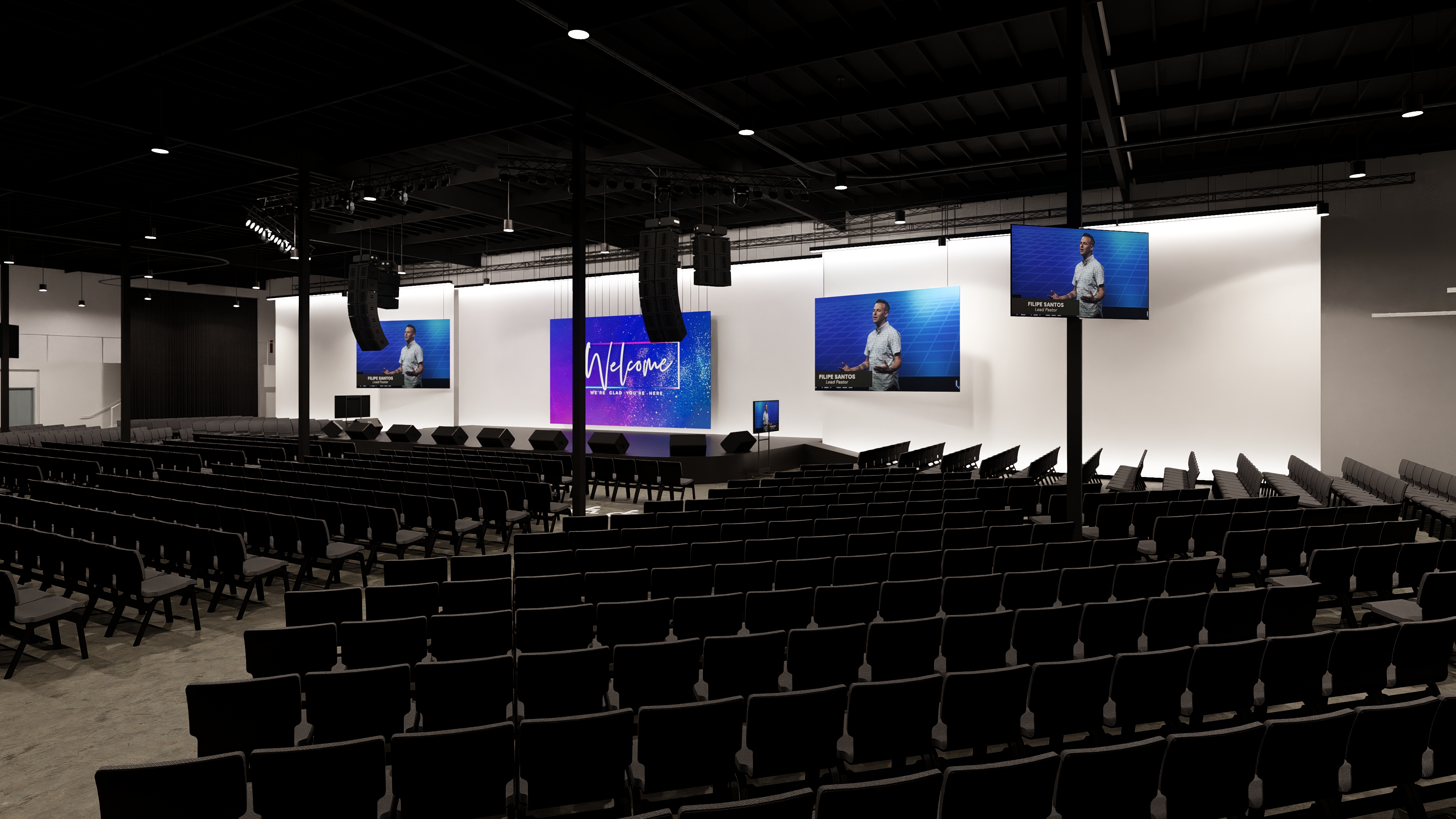 populate chruch aditorium with people add worship band on stage do not change imge on tc screens