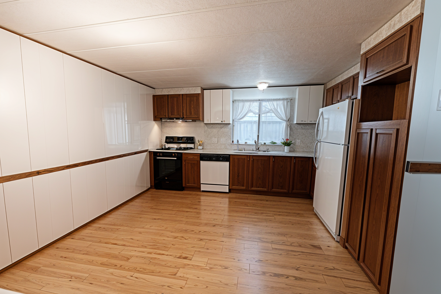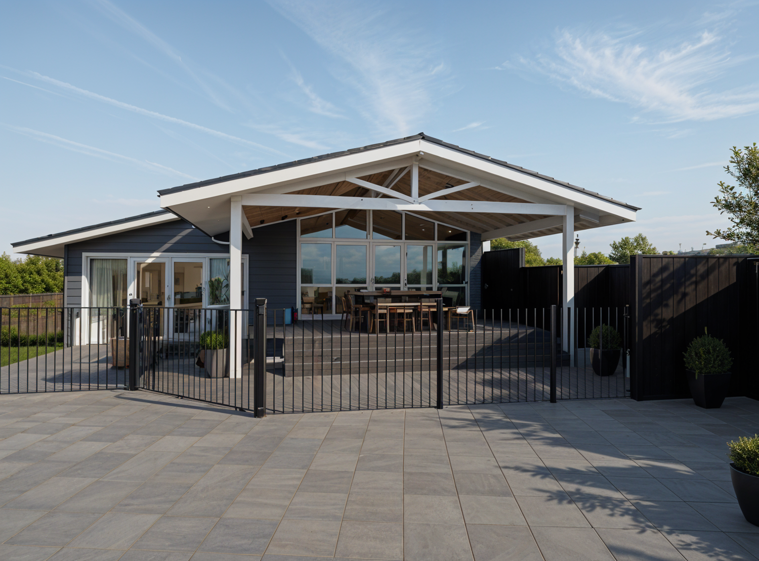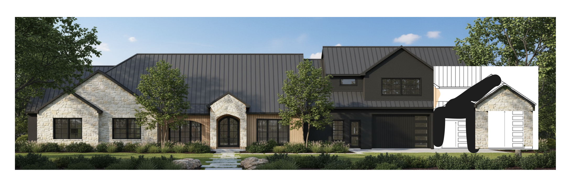 keeping the textures and colors the exact same will you render this photo i need you to add the garages on at the end on the left side one garage will be black one will be the matching creamy stone