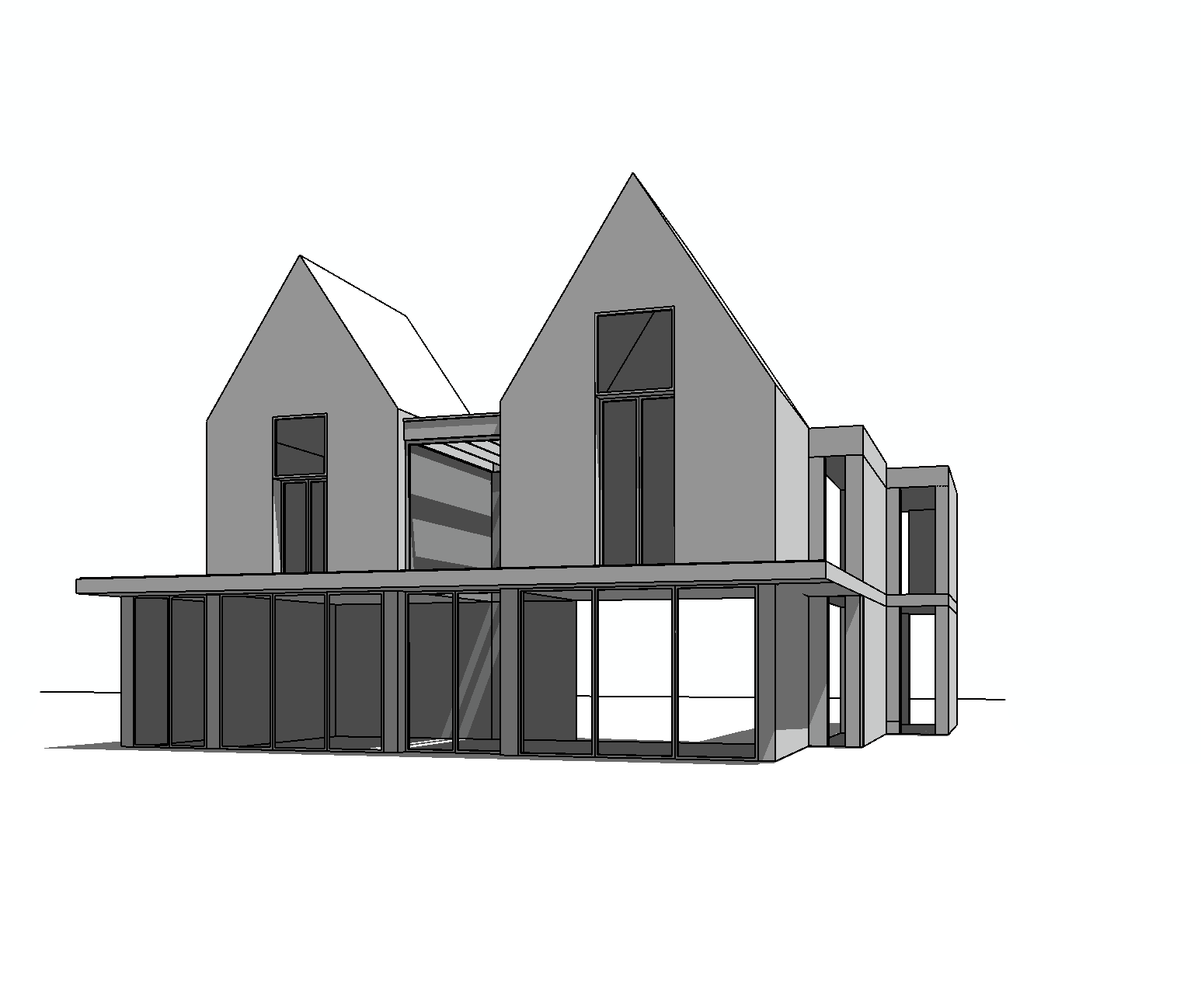 nordic exterior shot keeping the same view perspective can you make this photorealistic main house with a pale silver timber cladding sitting over a darker stone ground floor level with large sliding glass doors and a dark metal canopy between them with a realistic swimming pool in the foreground and a view out over padstow bay in the background keeping the same view and showing neighbouring buildings with a white rendered single storey bungalow on the left and a large 2 storey edwardian pebble dash villa on the right both with slate roofs on the other side of the garden walls add planting and garden furniture outside the building and some people on the terrace and also some activity in the pool add some more clouds to the sky the top parts of the gable extensions should be wide board warm silver timber cladding the lower parts are a medium dark stone the garden walls in a drywall stacked cornish granite and the main roof would be a welsh slate architecture