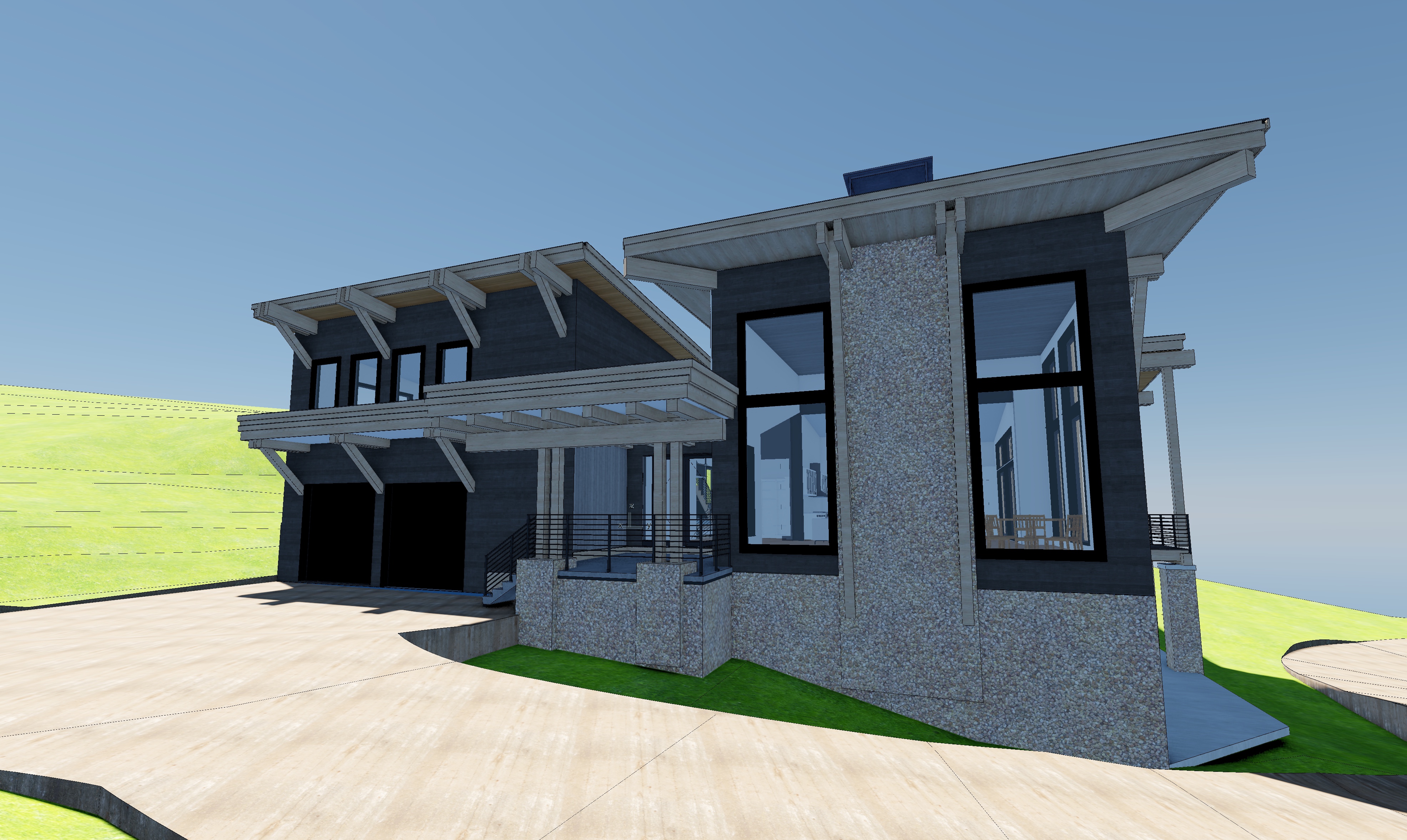 mountain modern ski house rustic stone base chimney suv in driveway left snowy pine forest in the background sunset